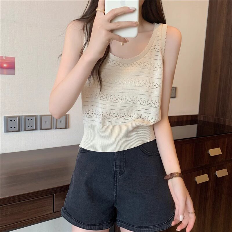 上衣夏 冰丝无袖 白色吊带背心女内搭法式 设计感镂空打底外穿针织衫