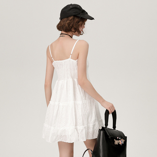 Girlyhalo芭蕾风白色吊带连衣裙女镂空蝴蝶结绑带提花宽松连衣裙