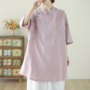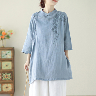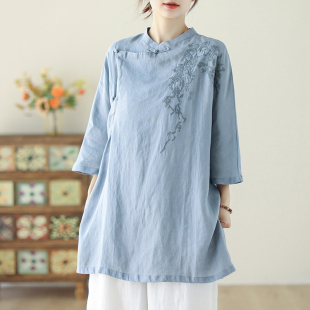 盘扣斜襟亚麻刺绣唐装 中国风禅意茶服新中式 中长上衣女 清仓 反季