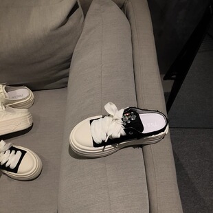 女夏外穿2026新款 厚底休闲凉拖鞋 韩版 水钻帆布鞋 子 时尚 包头半拖鞋