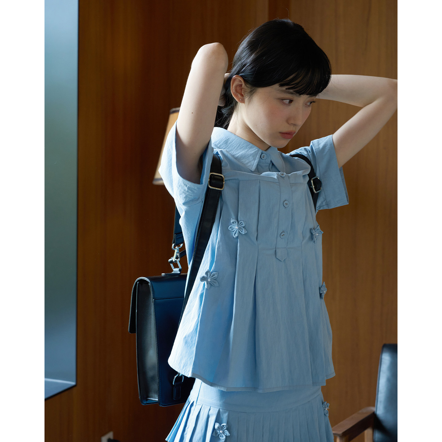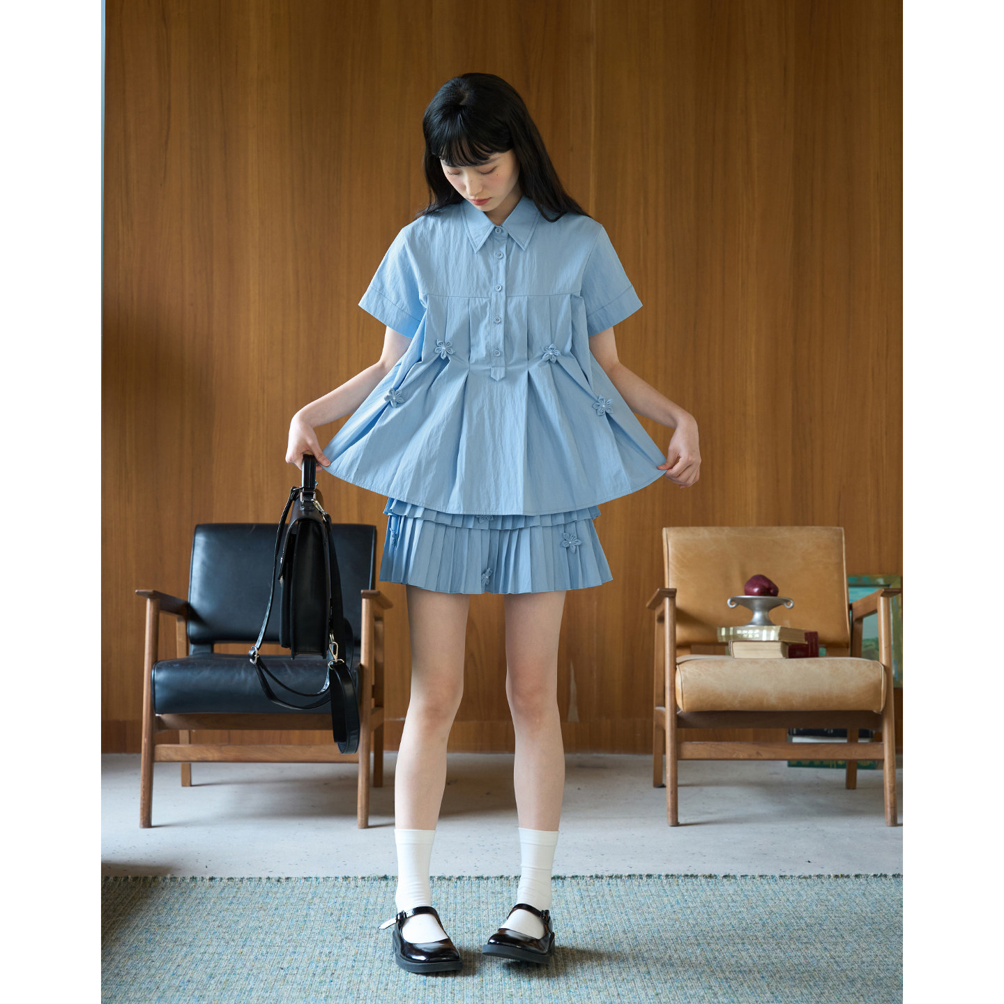 百褶半裙套装 aww polo领 衬衫 手工制花蓝色礼记·百褶短袖