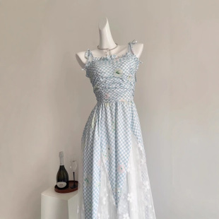吊带裙 蓝色漂亮碎花边蕾丝拼接女款 现货秒发PINKMOON 一见钟情