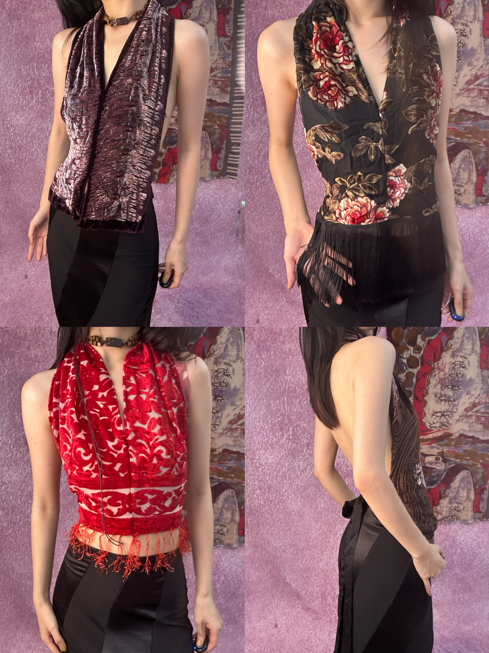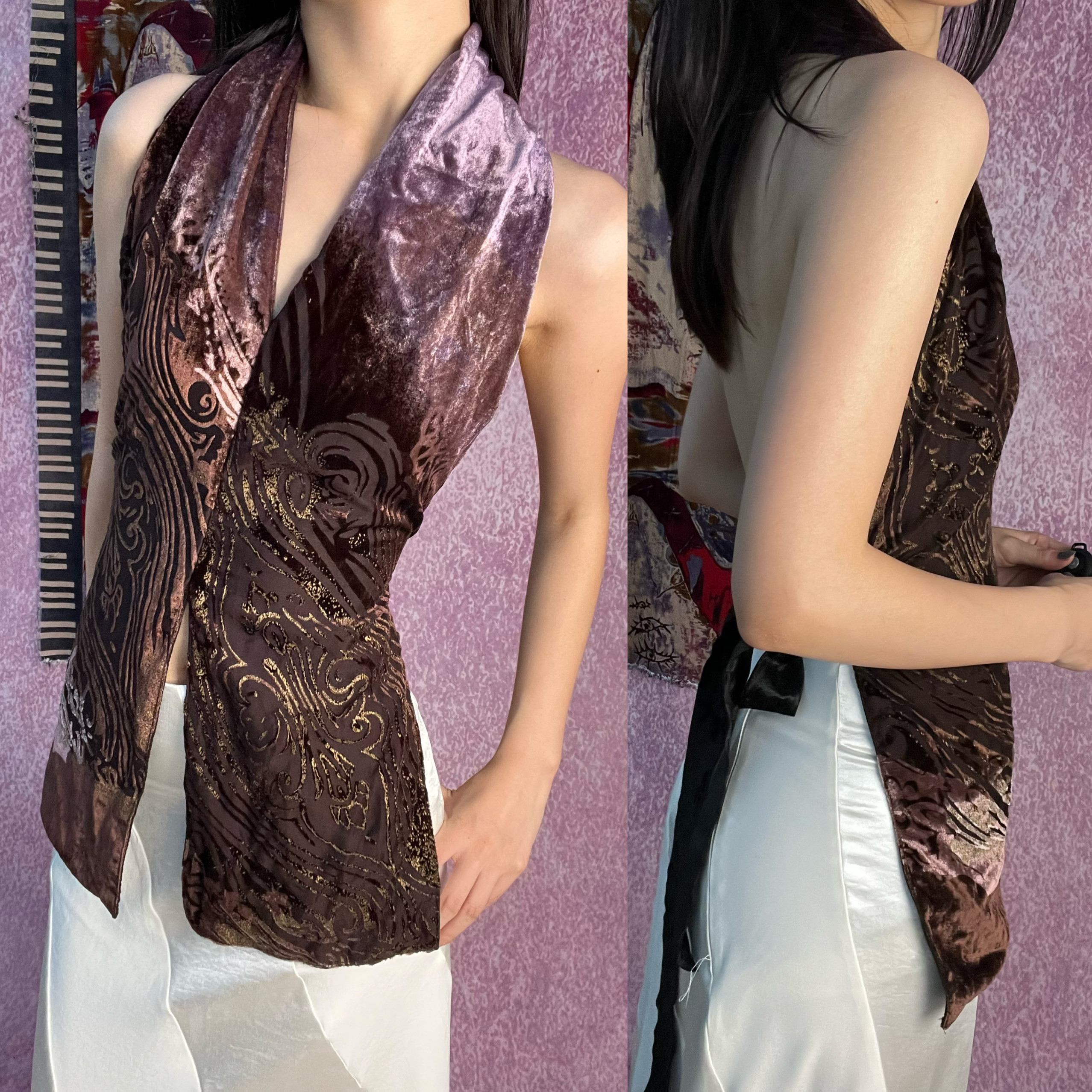 对襟款 复古辣妹挂脖吊带背心内搭 真丝底烂花丝绒限量绑带一片式