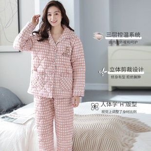 保暖加厚休闲格子家居服套装 长裤 睡衣女纯棉三层夹棉长袖 浪莎冬季