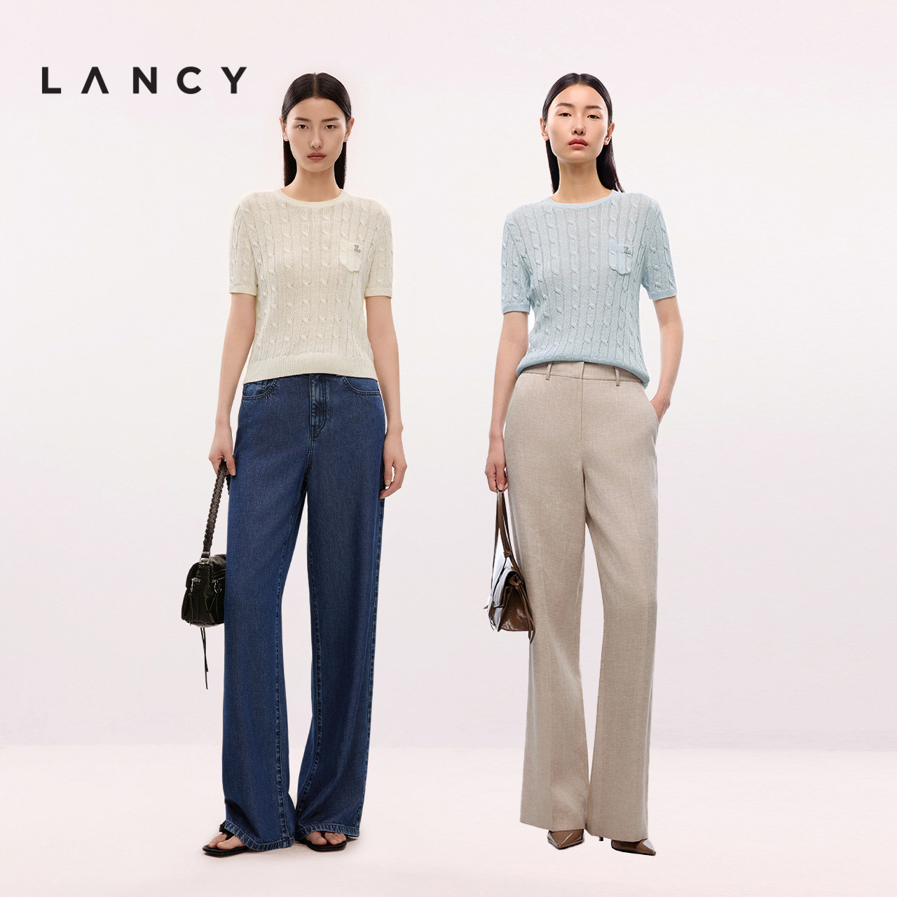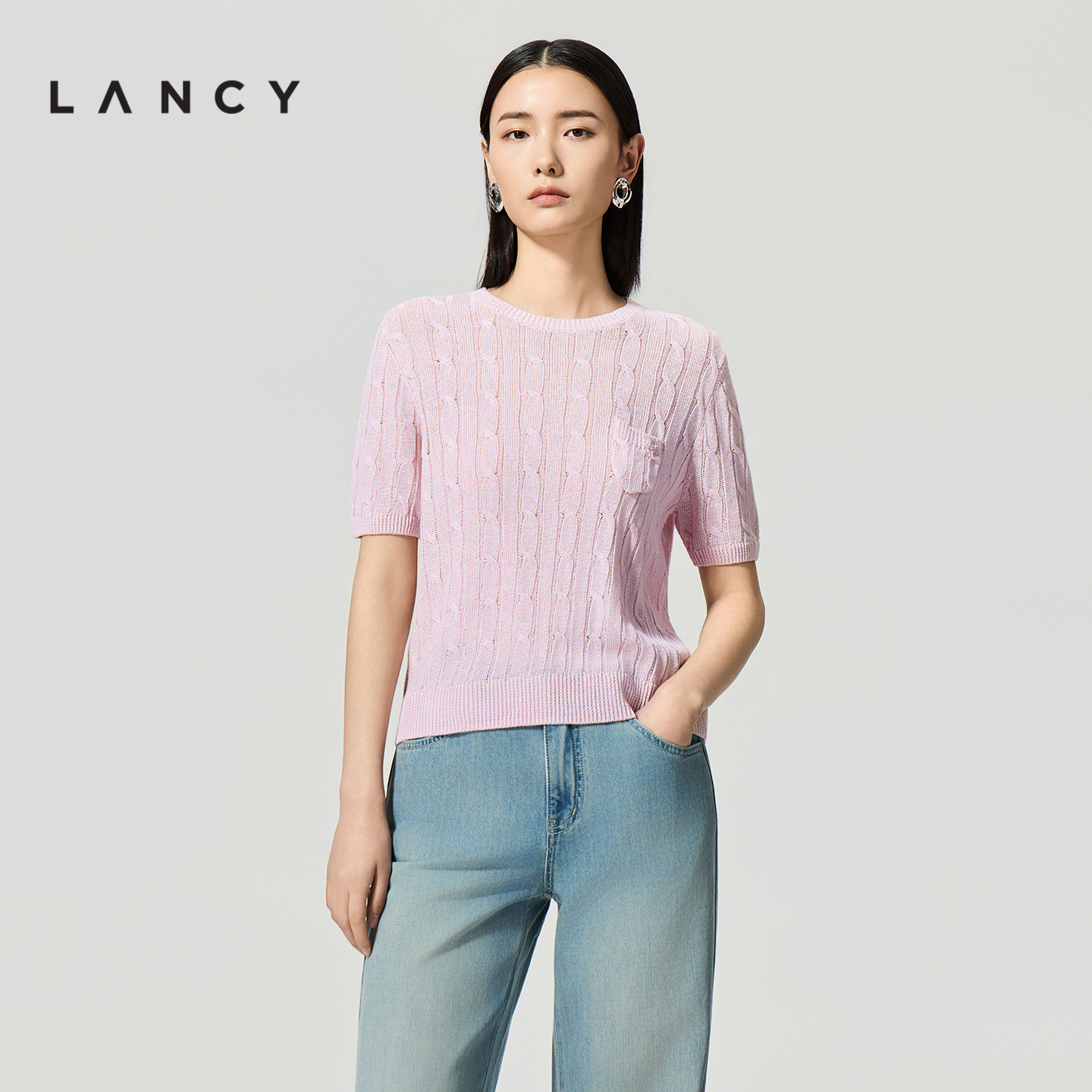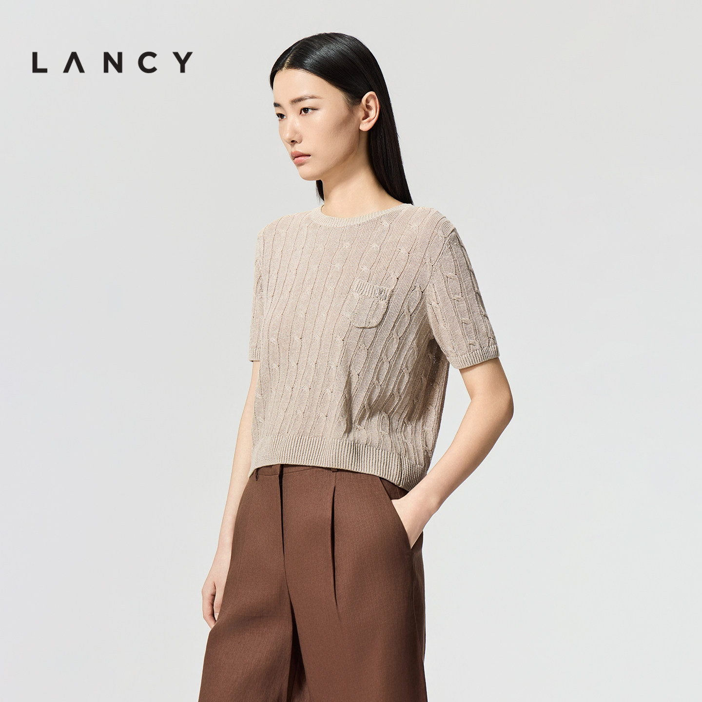 朗姿夏季 LANCY 新款 气质高级感圆领绞花短袖 T恤女 针织衫 亚麻
