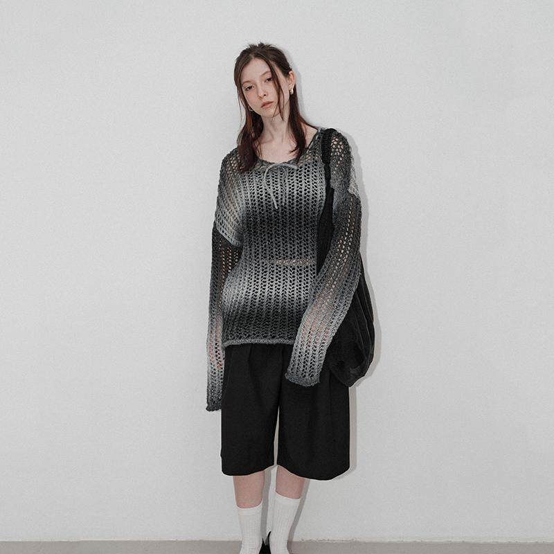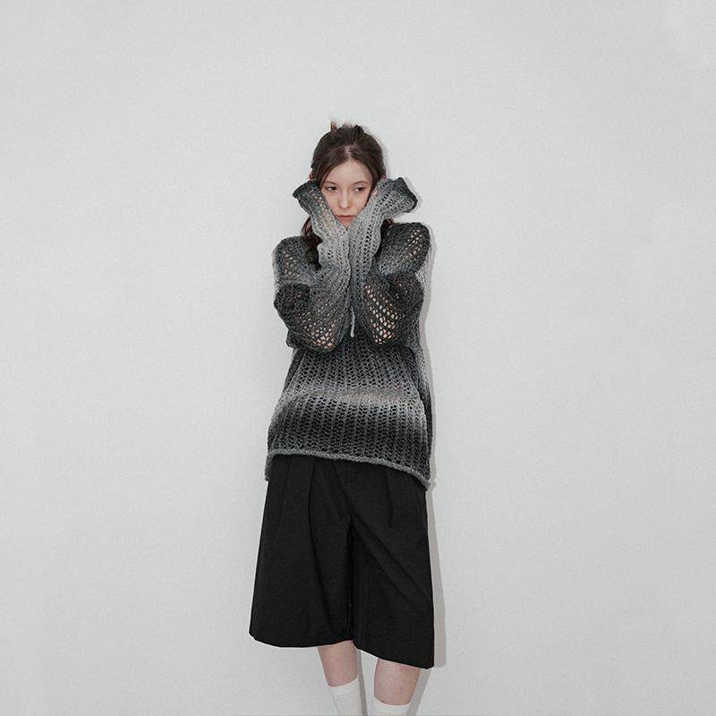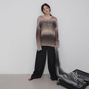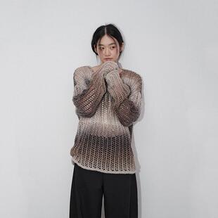 Chic Veega 慵懒风渐变镂空钩花肌理圆领套头羊毛混纺毛衫 4折