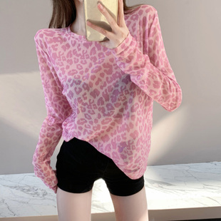 打底小衫 豹纹t恤女薄款 内搭上衣冰丝网纱长袖 透明防晒罩衫 夏新款