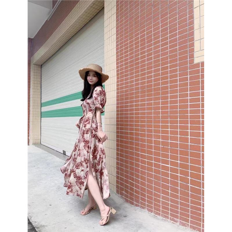 裙子气质开叉吊带裙 小众设计感泡泡袖 法式 复古碎花连衣裙女夏季