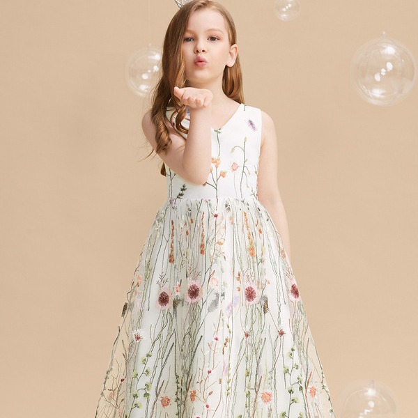 欧美高端女童无袖 礼服儿童刺绣网纱公主裙花童女孩钢琴演奏演出服