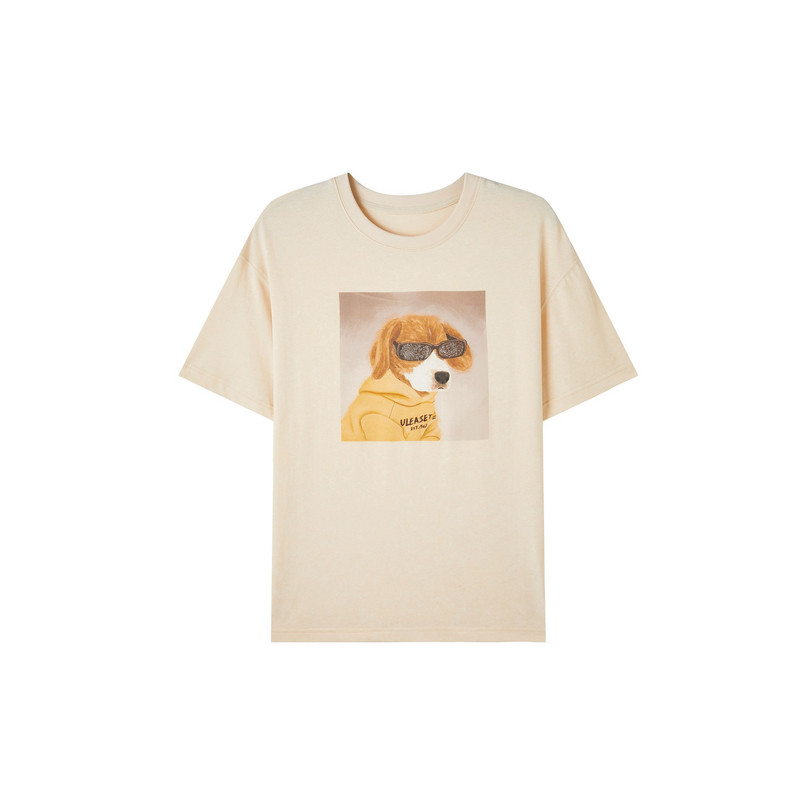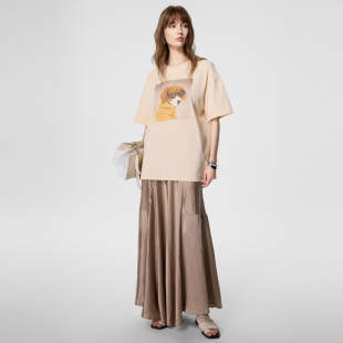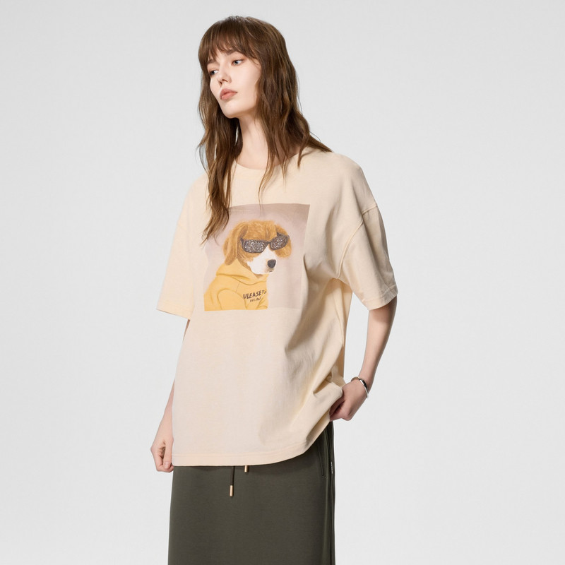 新款 夏季 设计感廓形休闲尤缇时尚 TI米咖色亮钻小狗印花T恤女装