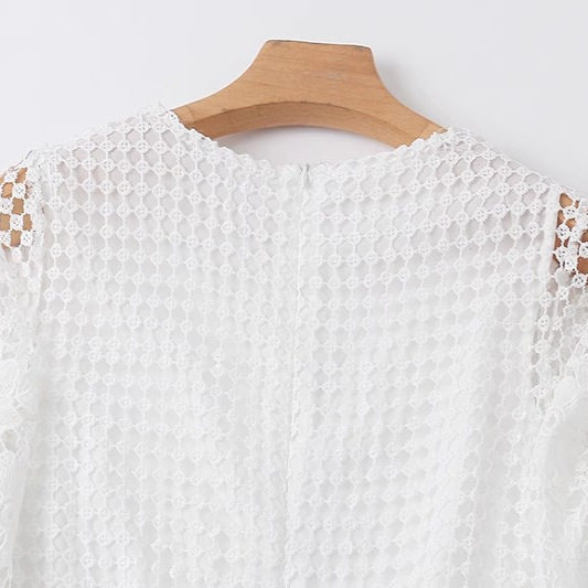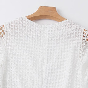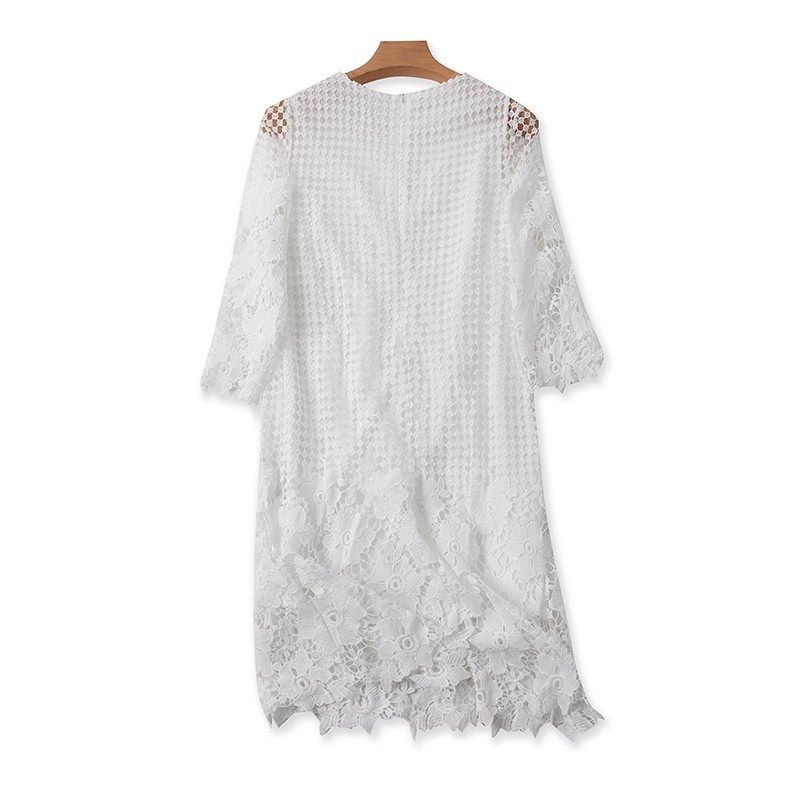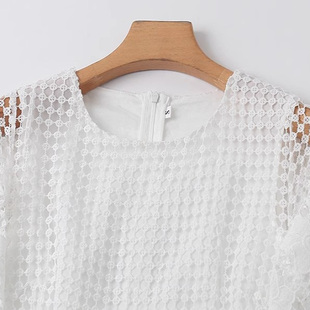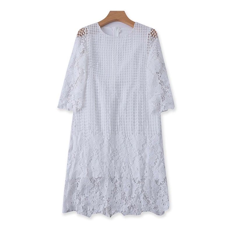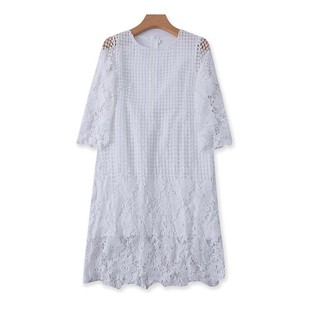 连衣裙 套头七分袖 春季 女装 裙子20314 新款 圆领蕾丝钩花镂空中长款