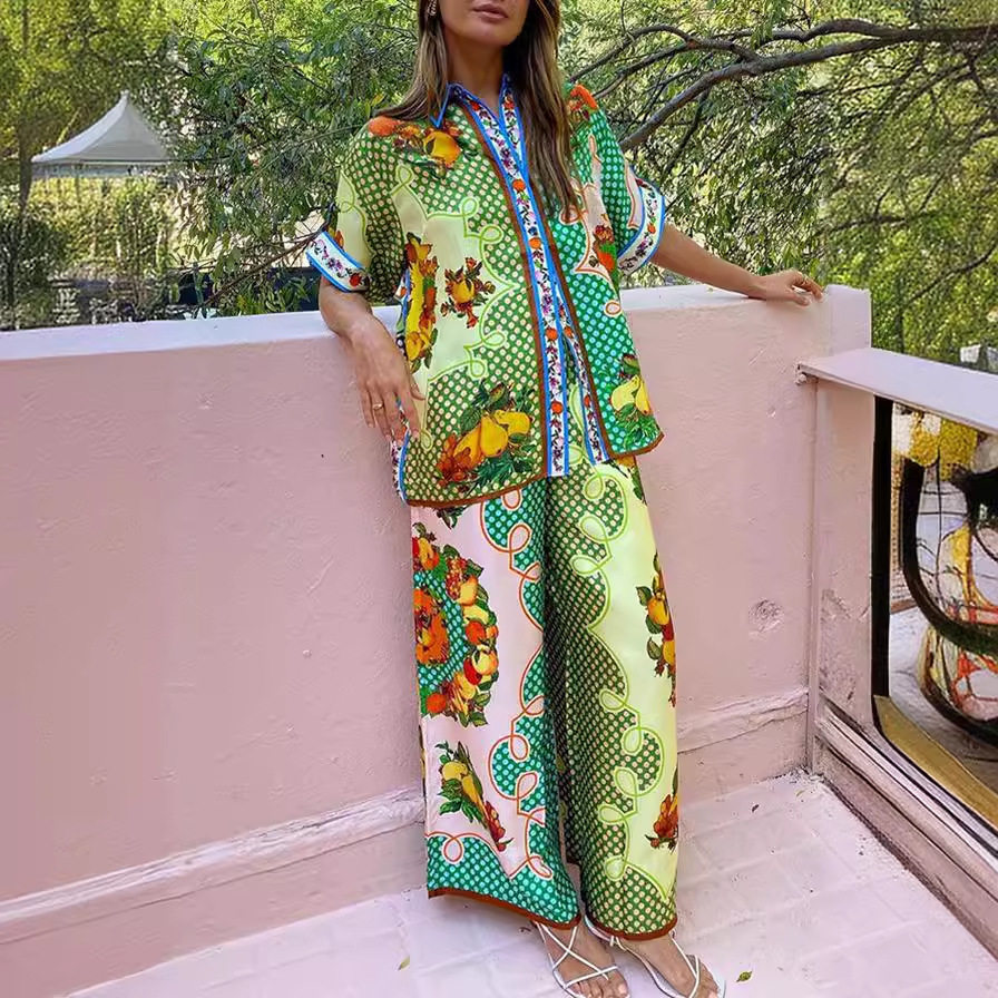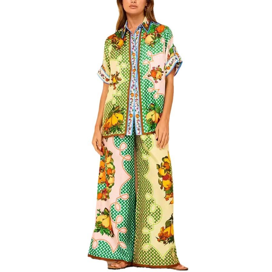 sleeved lapel piece satin set two short casual Printed shirt