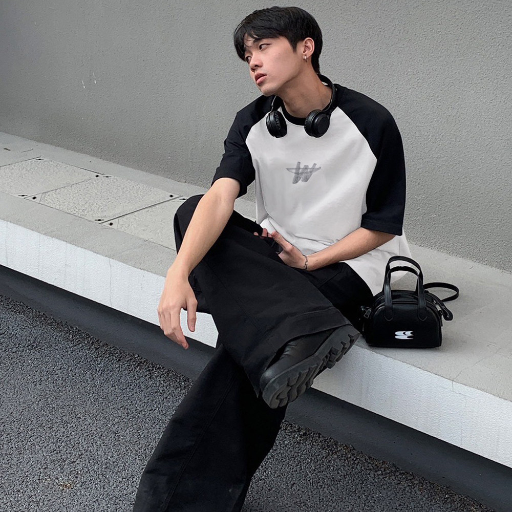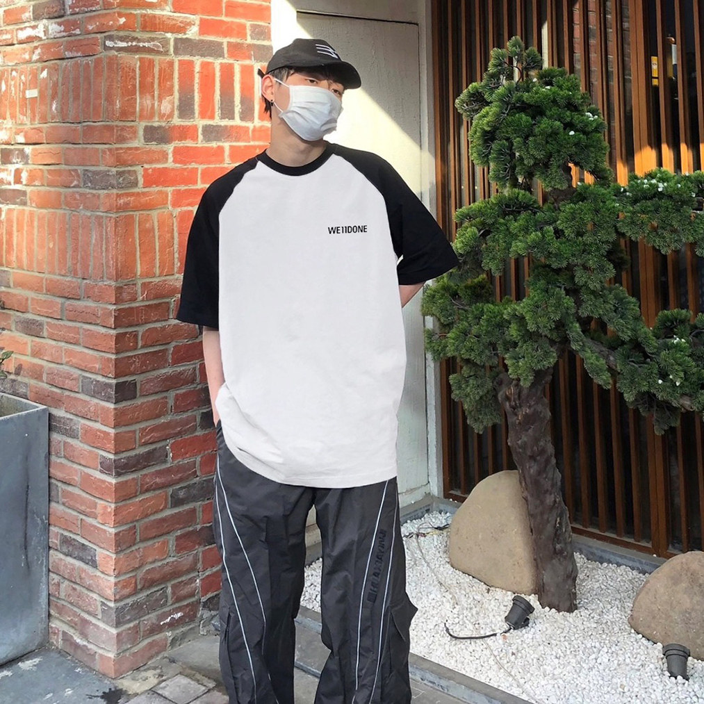宽松男女百搭纯棉拼接撞色t恤 小熊字母印花夏季 bshy well插肩短袖