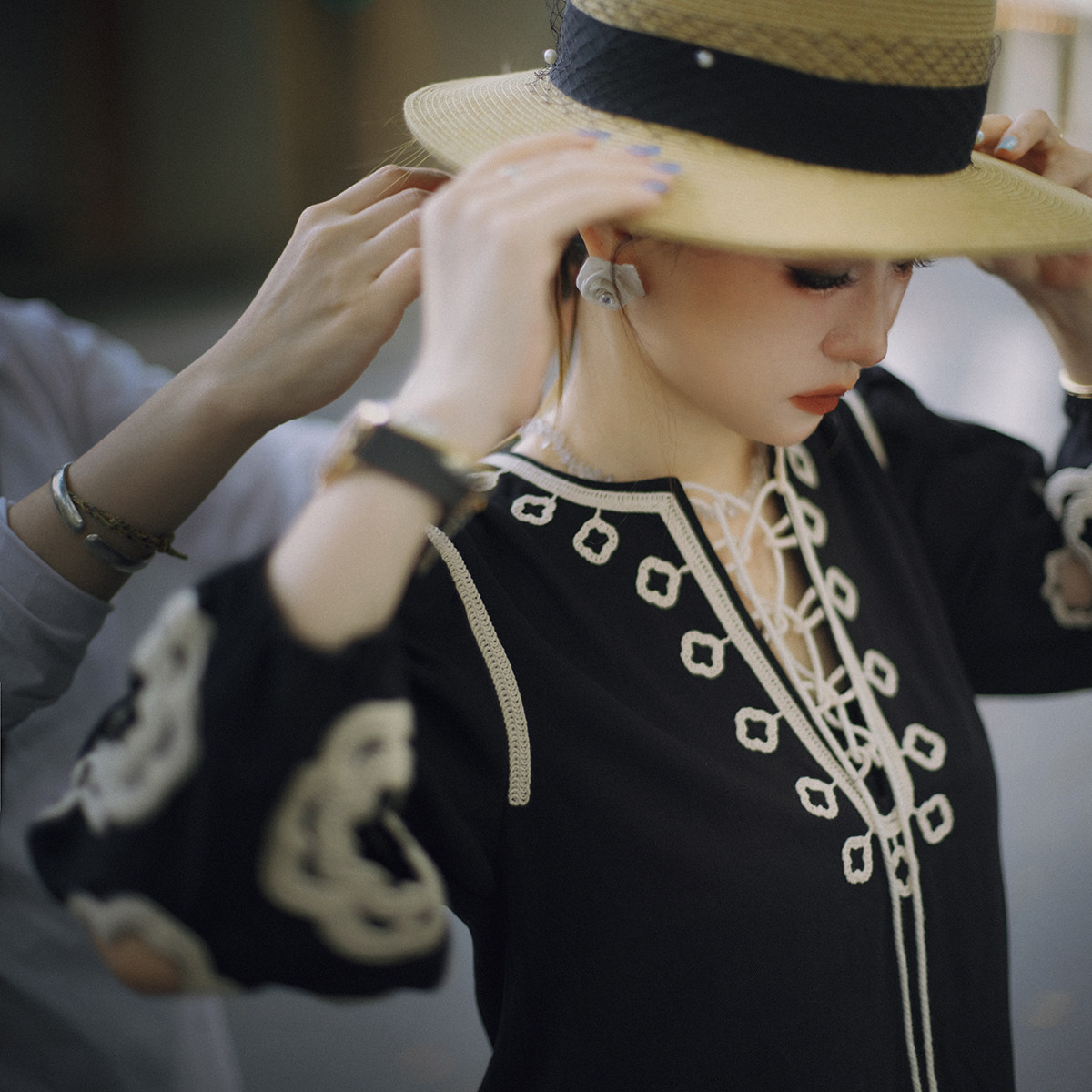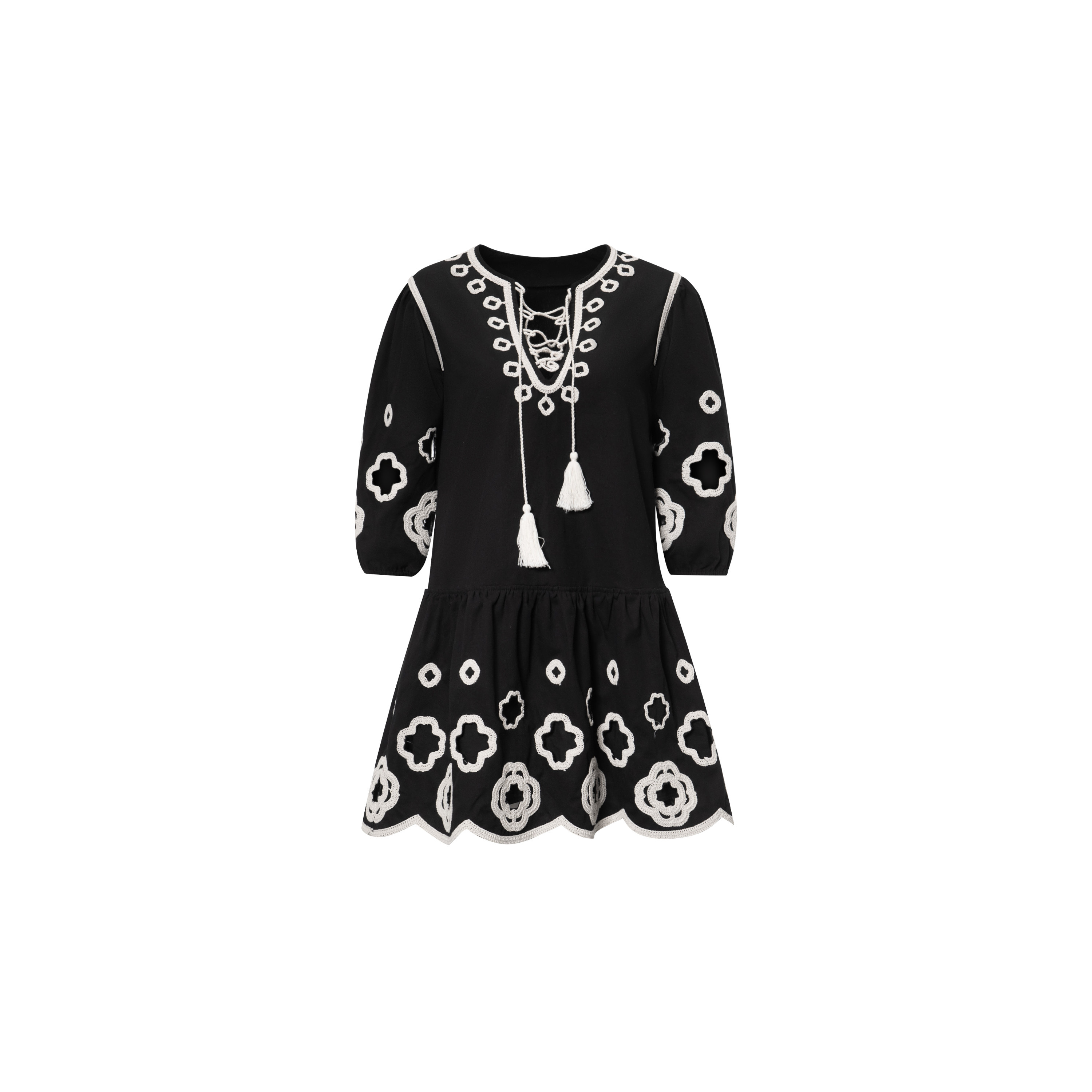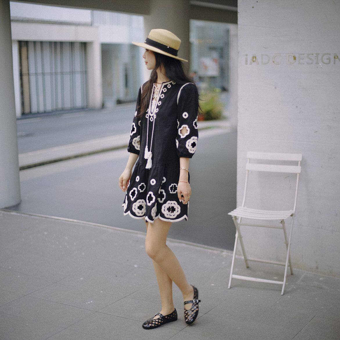 100棉撞色镂空绣花绑带波西米亚民族连衣裙WT52ZXY01 花间与共