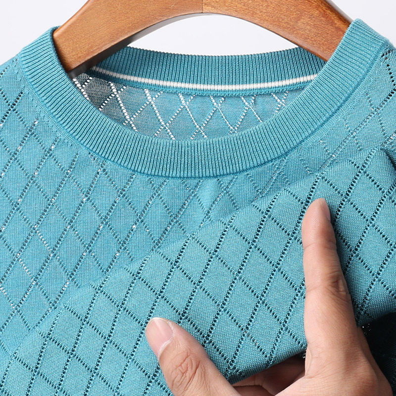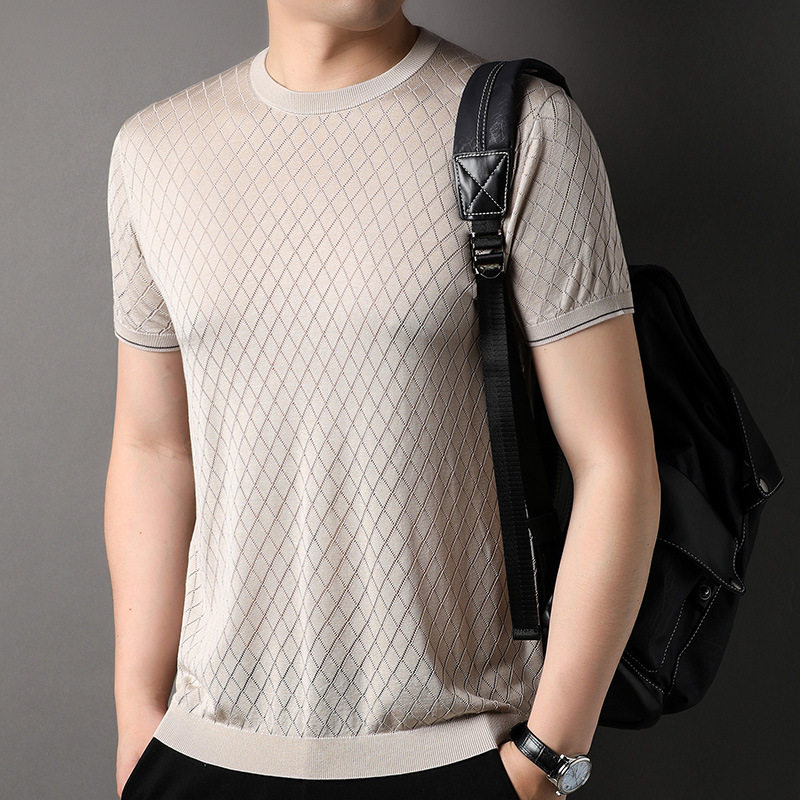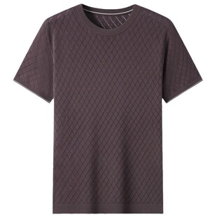 T恤商务休闲网格圆领高品质中年体恤 短袖 100%桑蚕丝高端男士 夏季