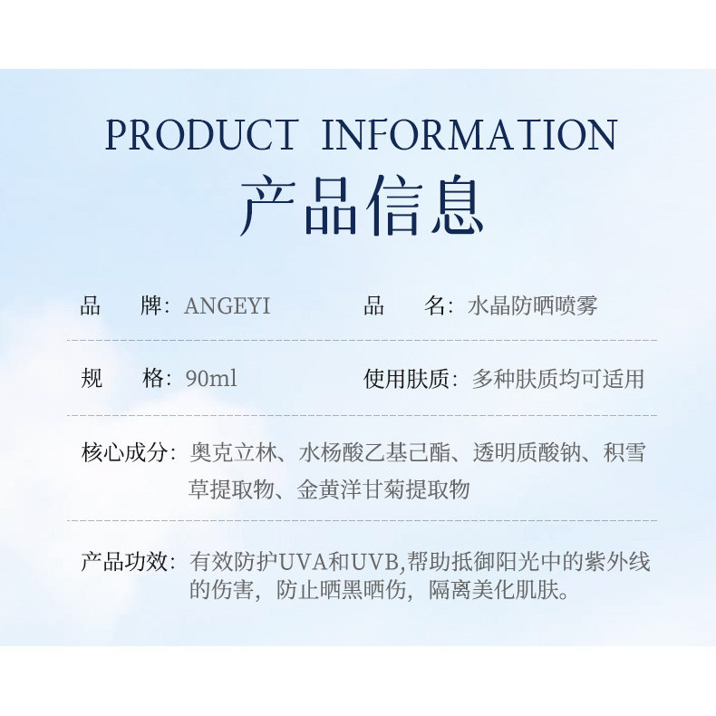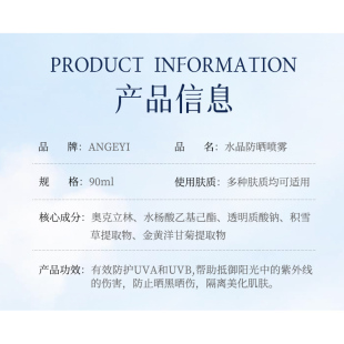 ANGEYI水晶防晒喷雾90ml 出游防军训 瓶防紫外线隔离男女通用夏季