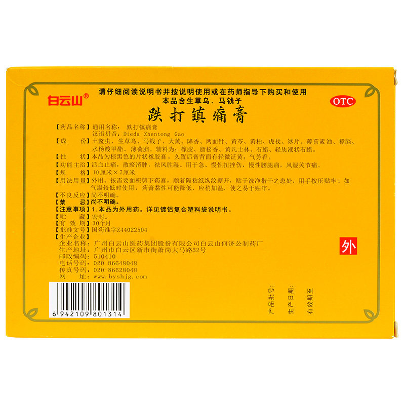白云山701跌打镇痛膏8贴活血化瘀消肿止痛膏腰腿痛风湿关节炎痛片