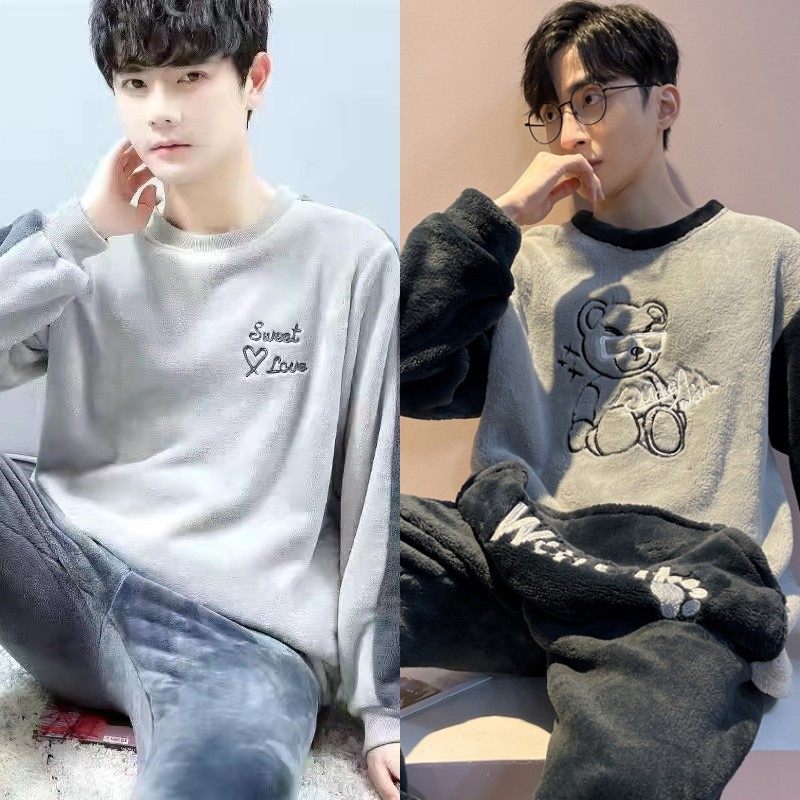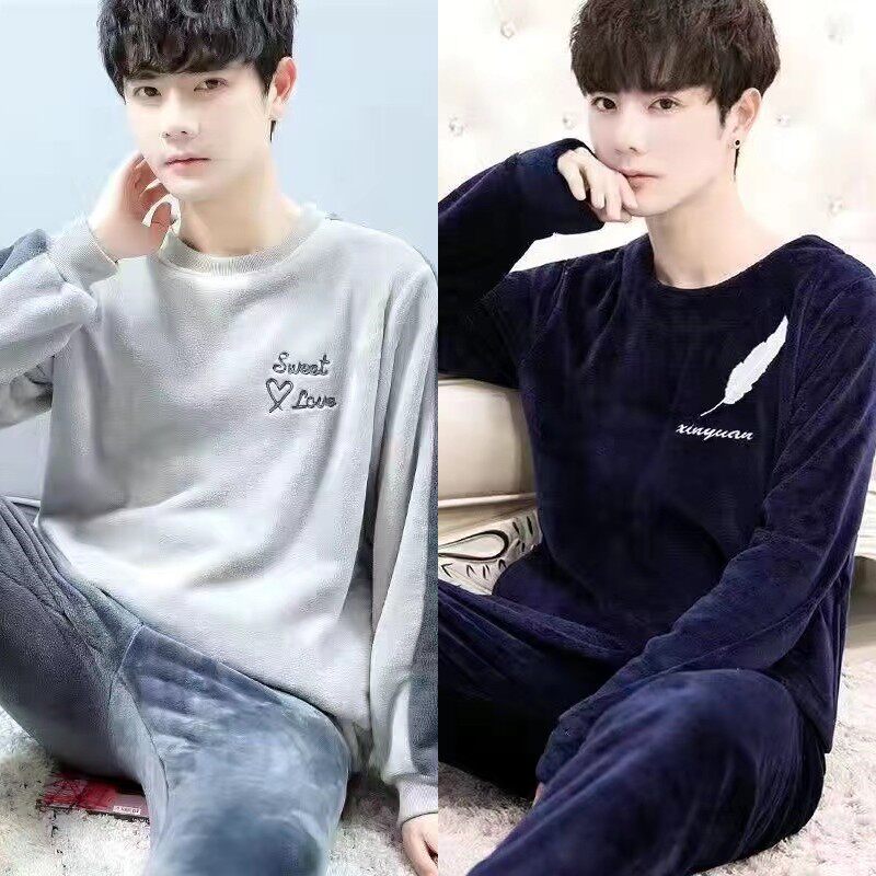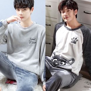秋冬款 家居服加大码 加厚加绒长袖 套装 法兰绒 珊瑚绒男冬季 睡衣男士