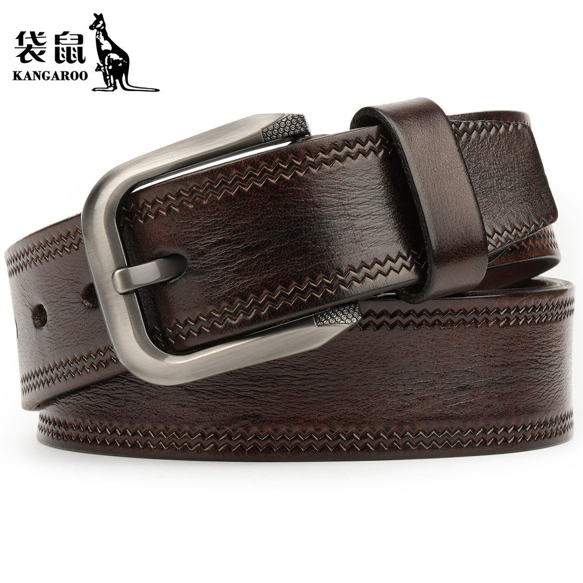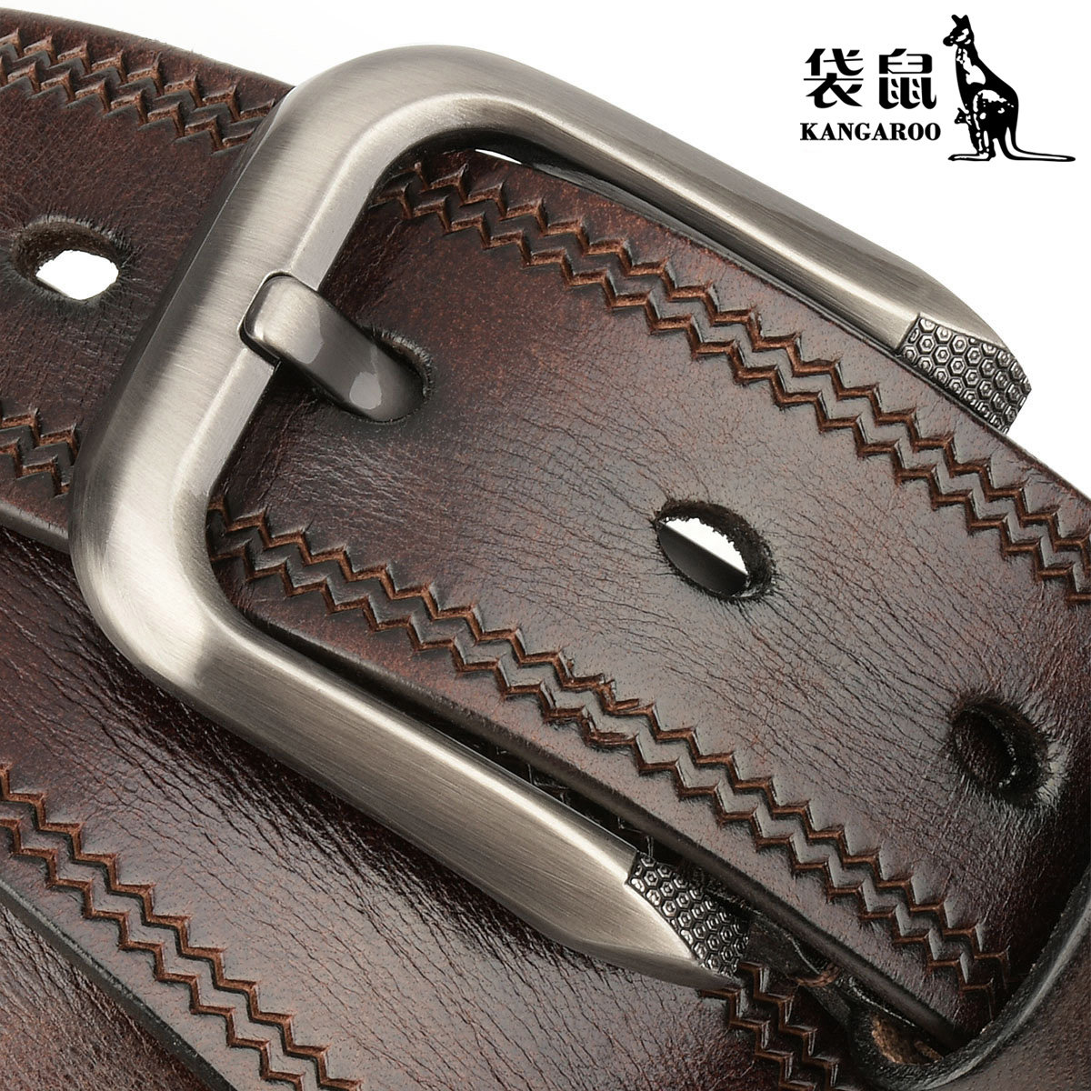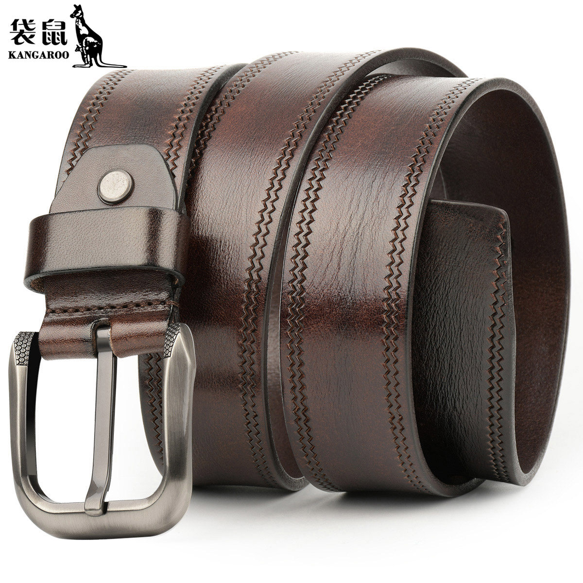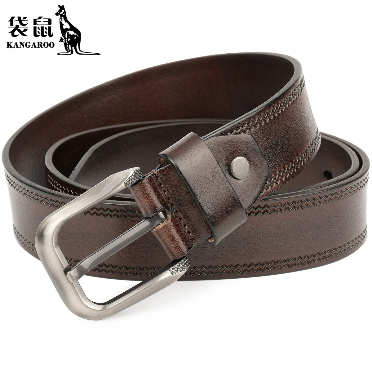 袋鼠头层牛皮皮带男真皮青年腰带休闲针扣裤 带男纯手工真皮压花
