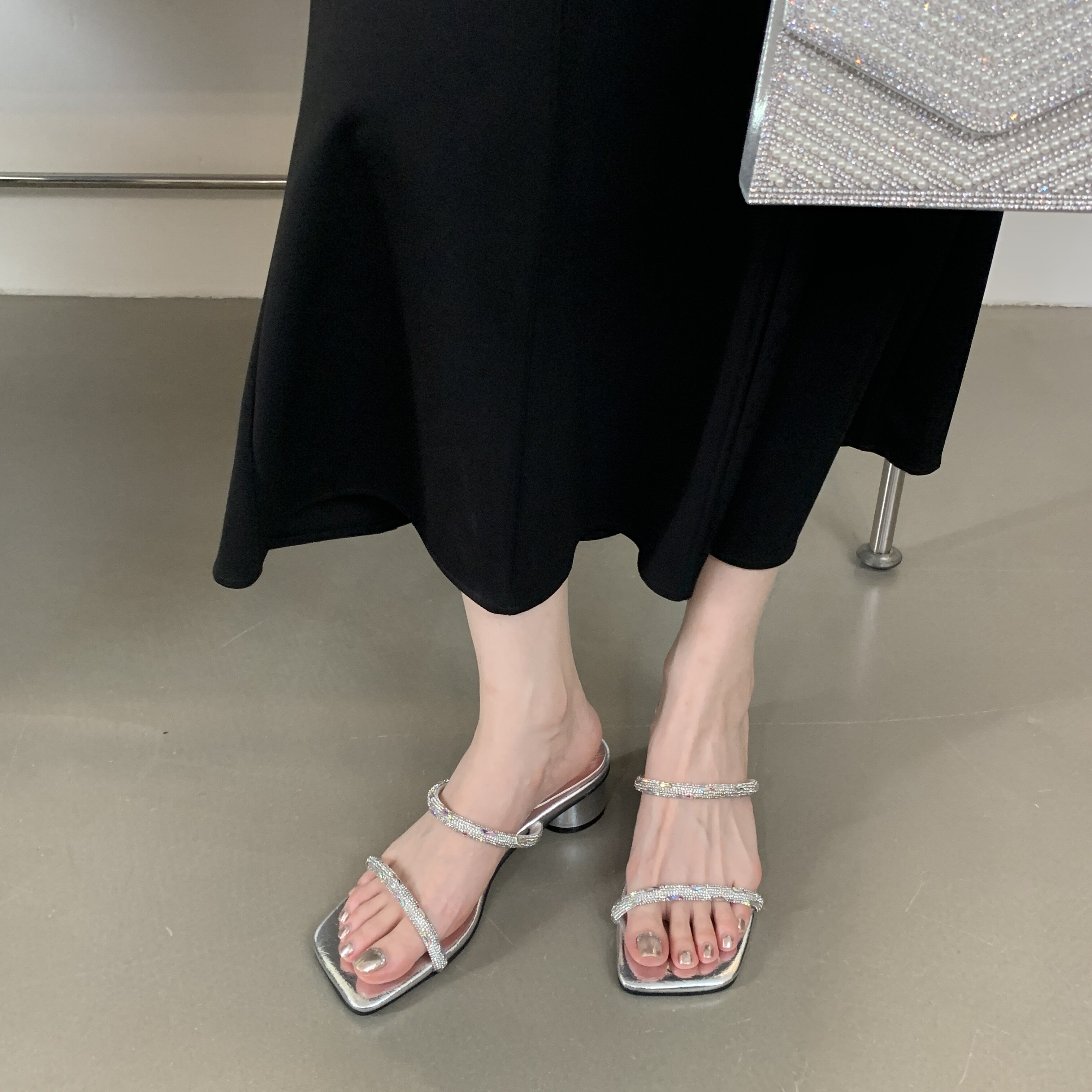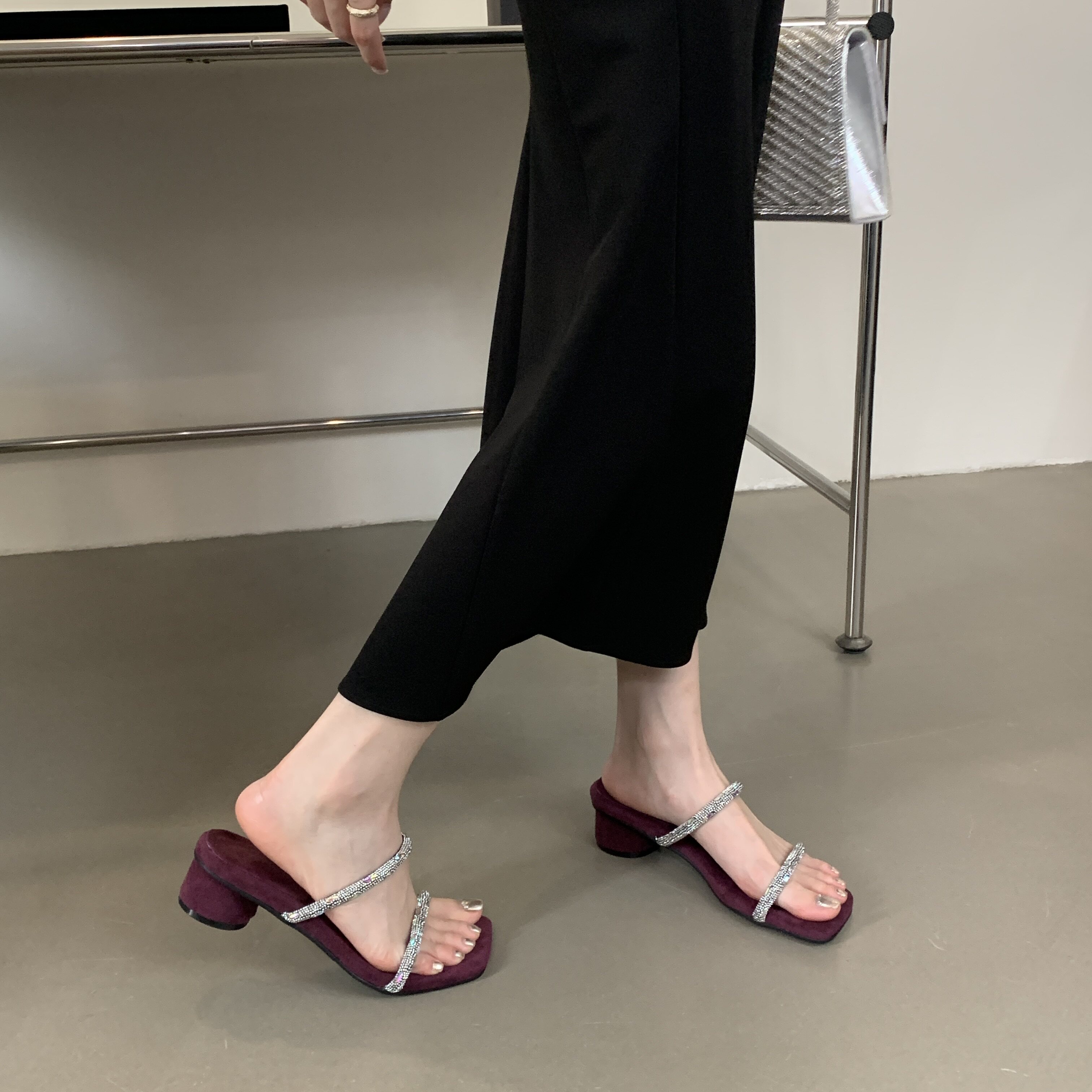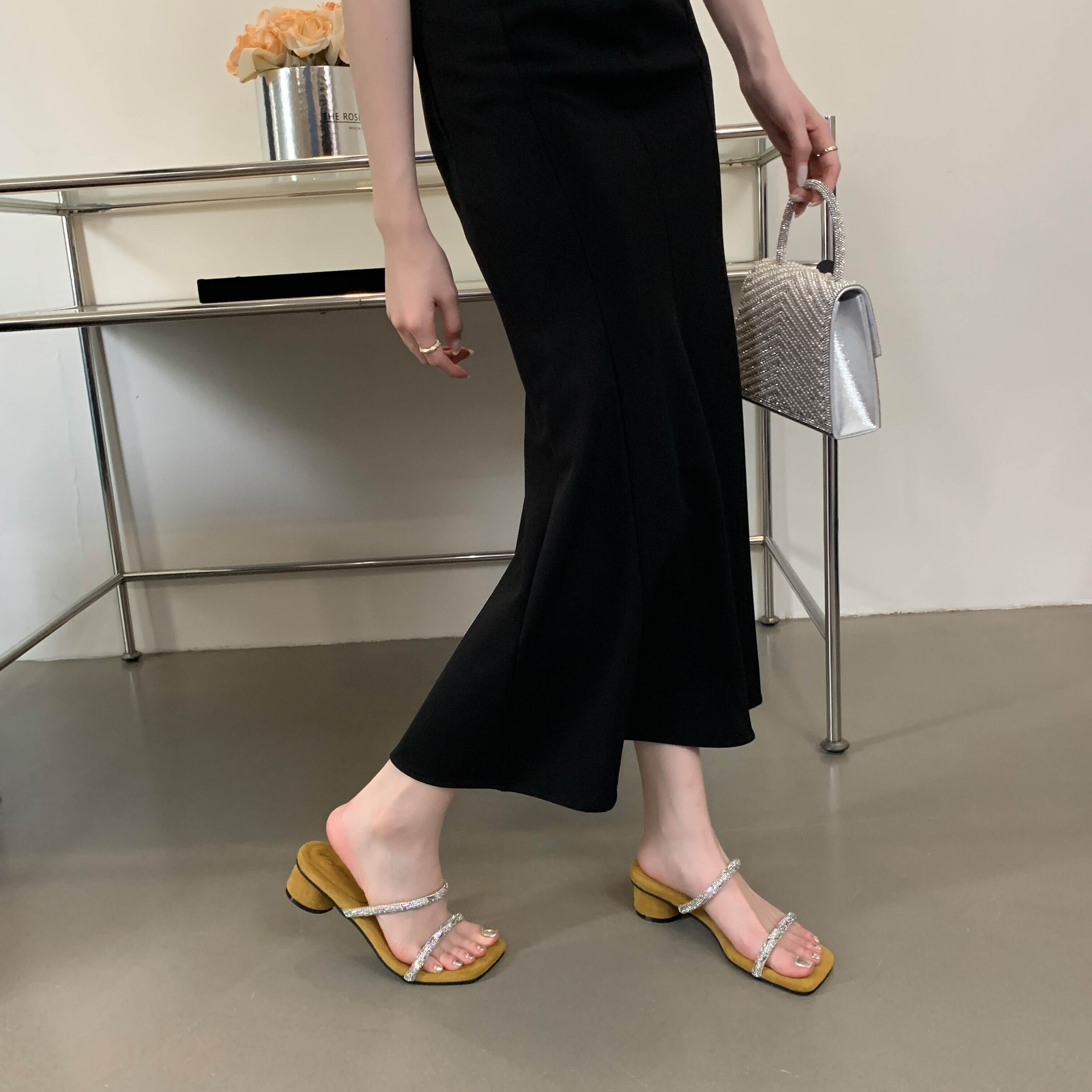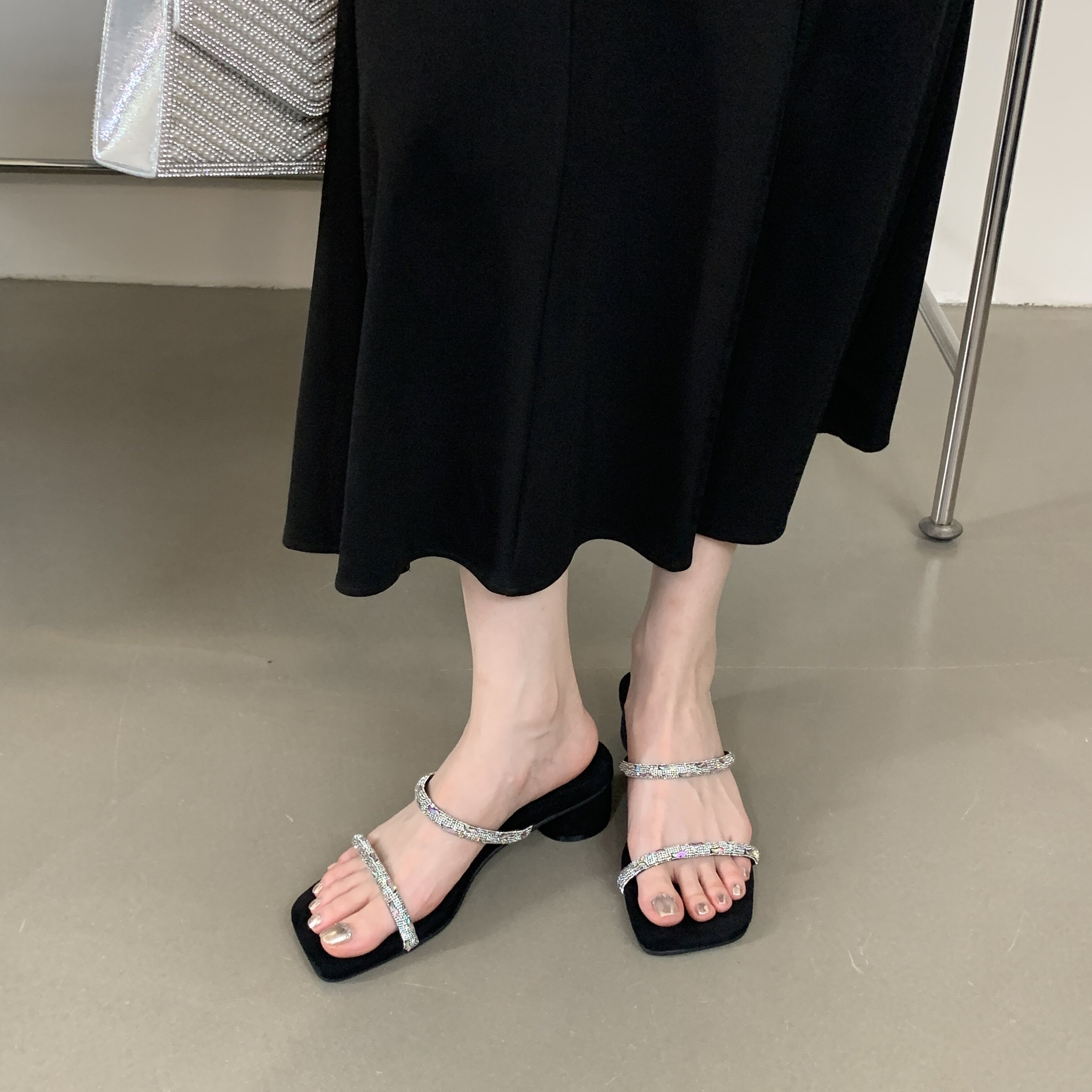 中低跟女鞋 欧美外贸一字带水钻欧洲站方头粗跟凉拖鞋 清货特价 断码