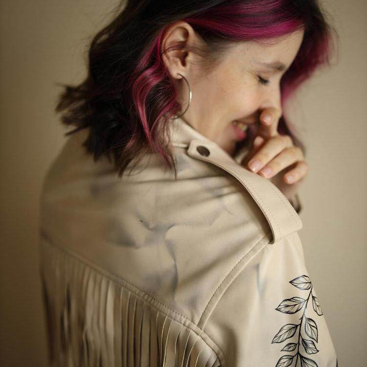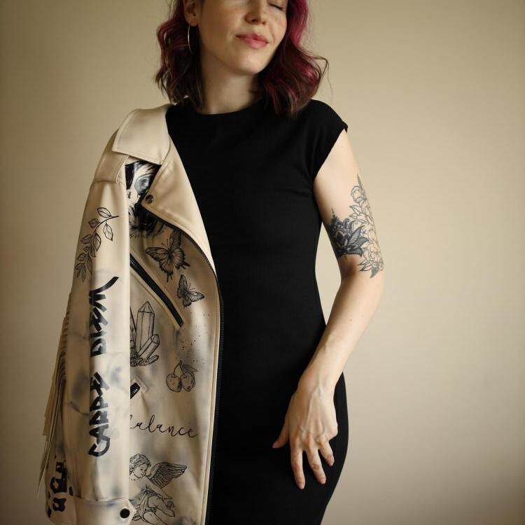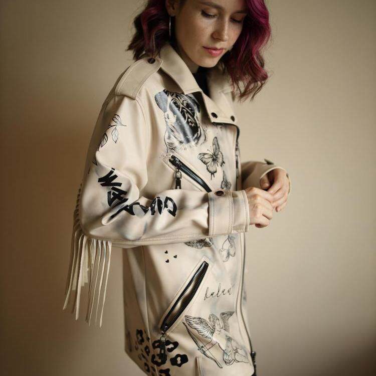 手绘小狗蝴蝶皮革夹克短外套 手作定制个性 乌克兰代购 Jacket㊣