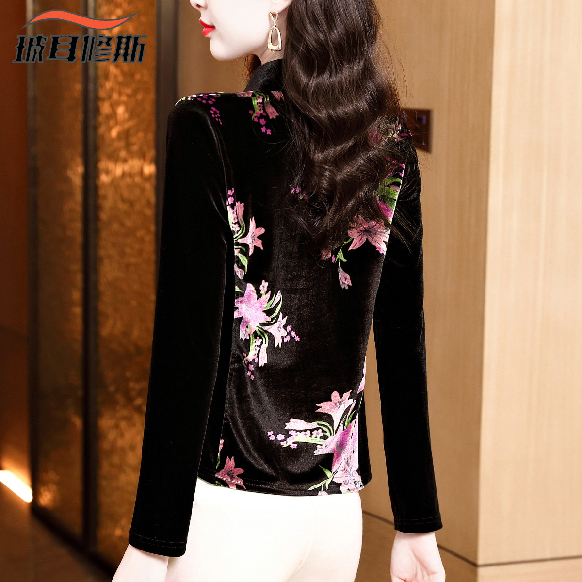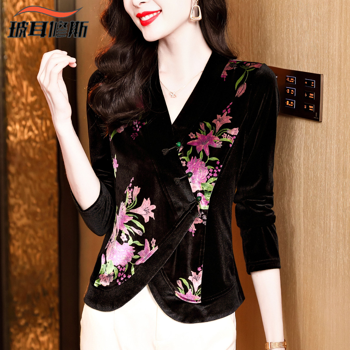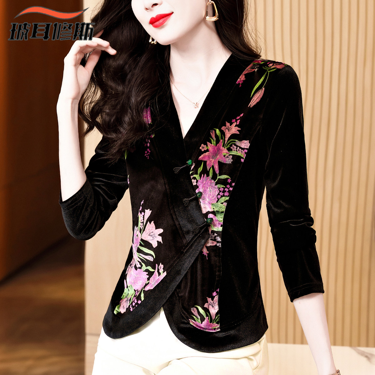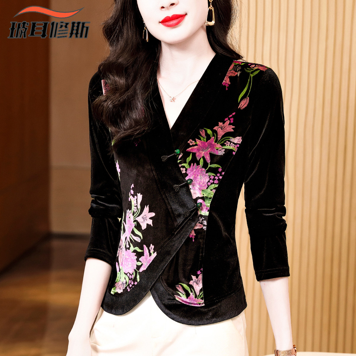 国风盘扣长袖 小西装 上衣女秋冬新款 外套时尚 金丝绒花色开衫 新中式