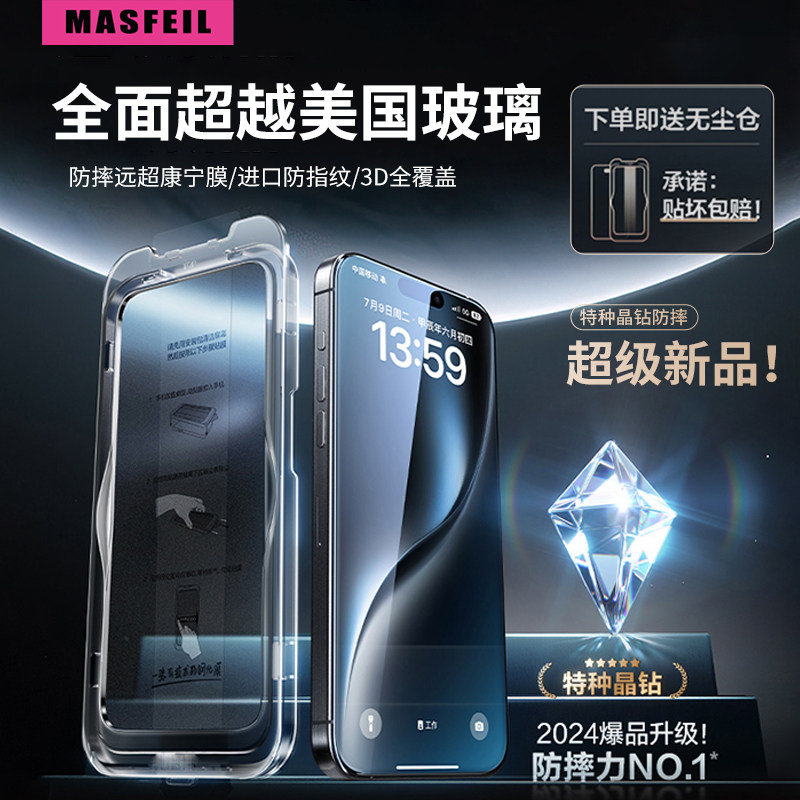 MASFIEL iPhone16ProMax钢化膜适用苹果16Pro手机膜15防摔ip14保护贴膜全屏覆盖13防指纹无尘仓高清pm全包