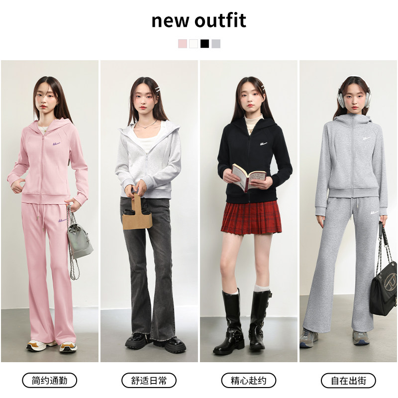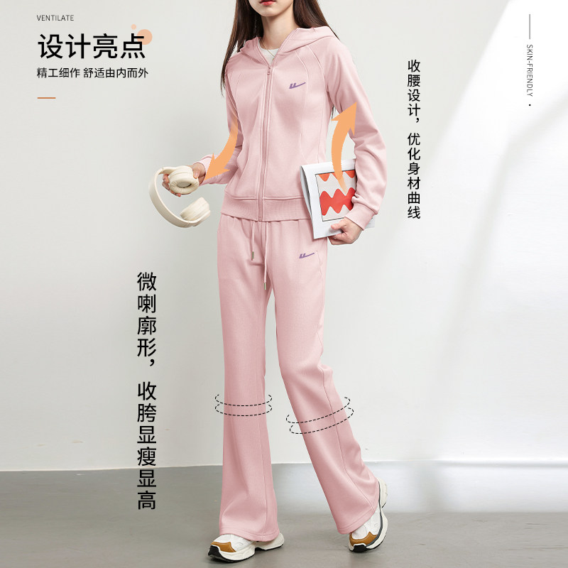 早秋穿搭套装 回力粉色休闲运动套装 新款 连帽卫衣微喇裤 女春秋修身