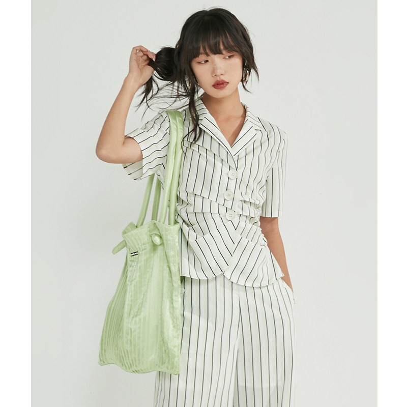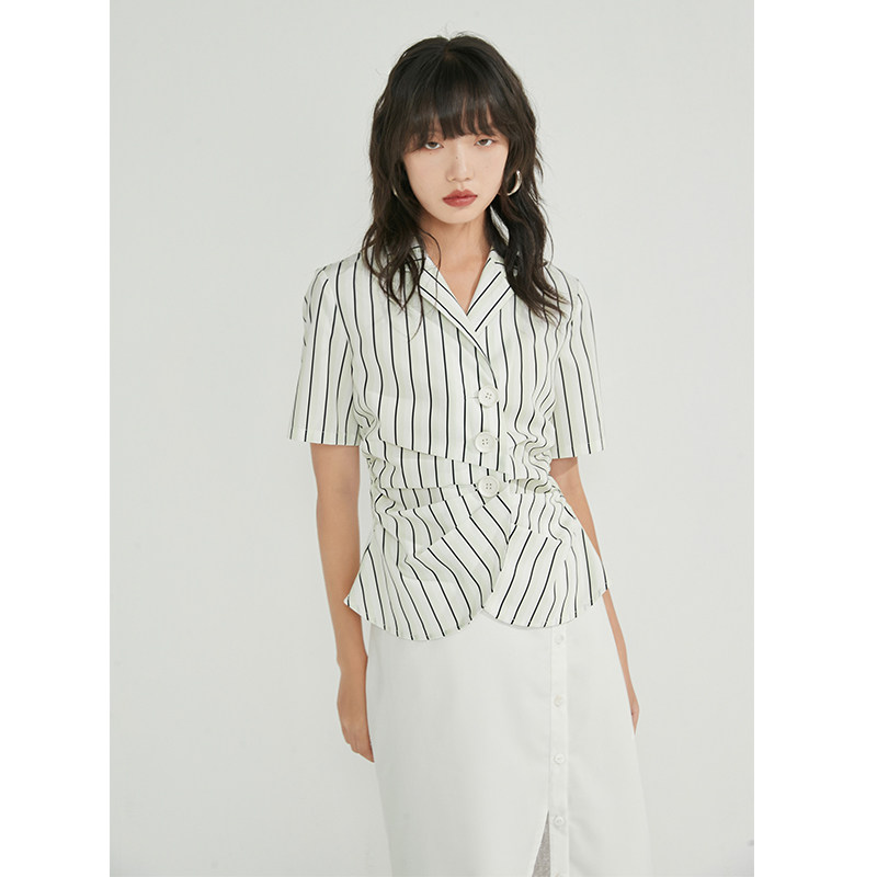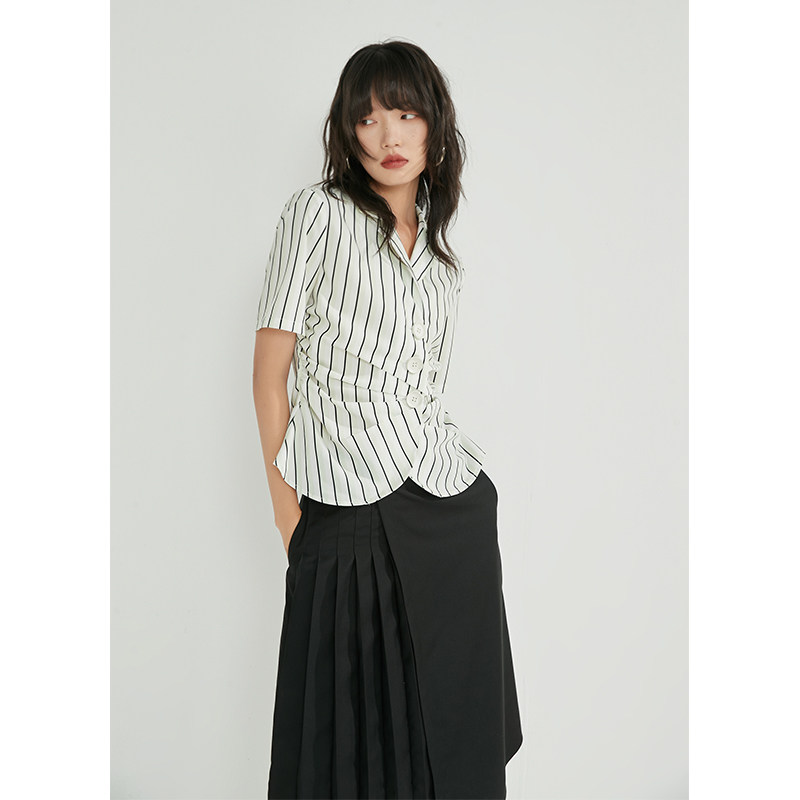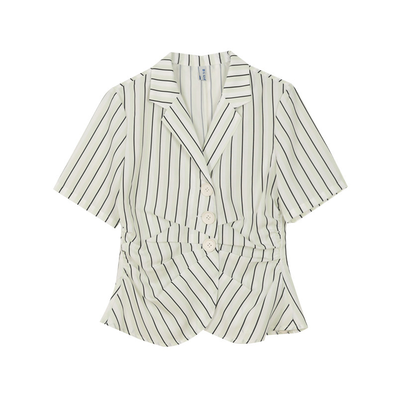 条纹抽褶衬衫 新款 短袖 女夏季 设计感衬衣 条纹衬衫 BLUEerror