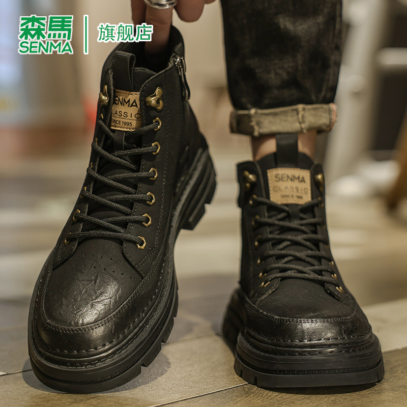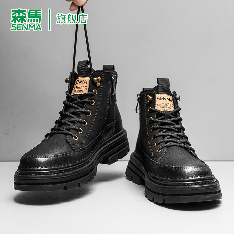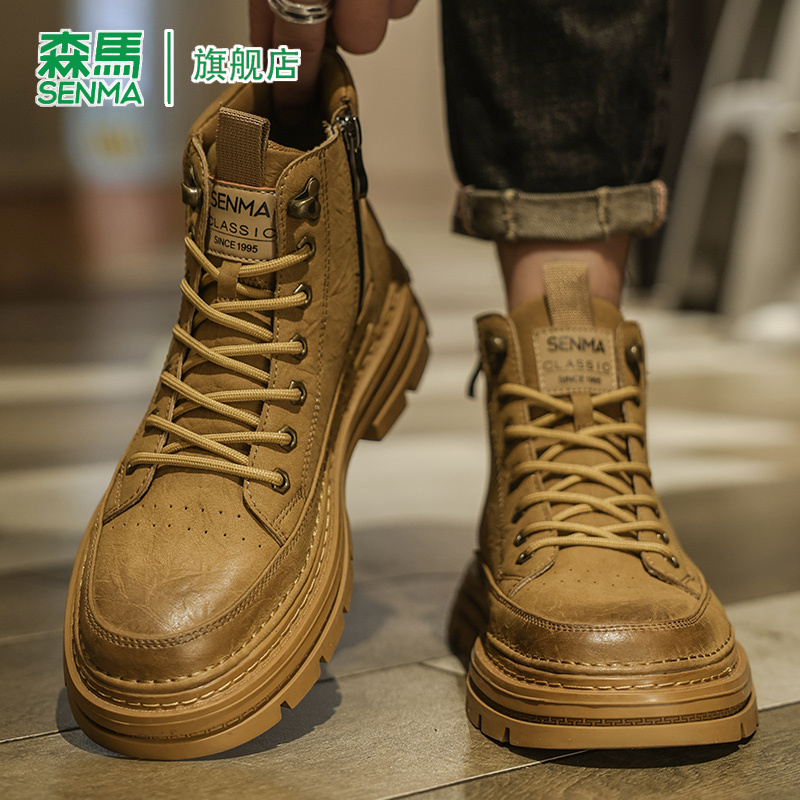 靴子 真皮防水厚底增高工装 森马马丁靴男秋季 高帮百搭休闲白色板鞋
