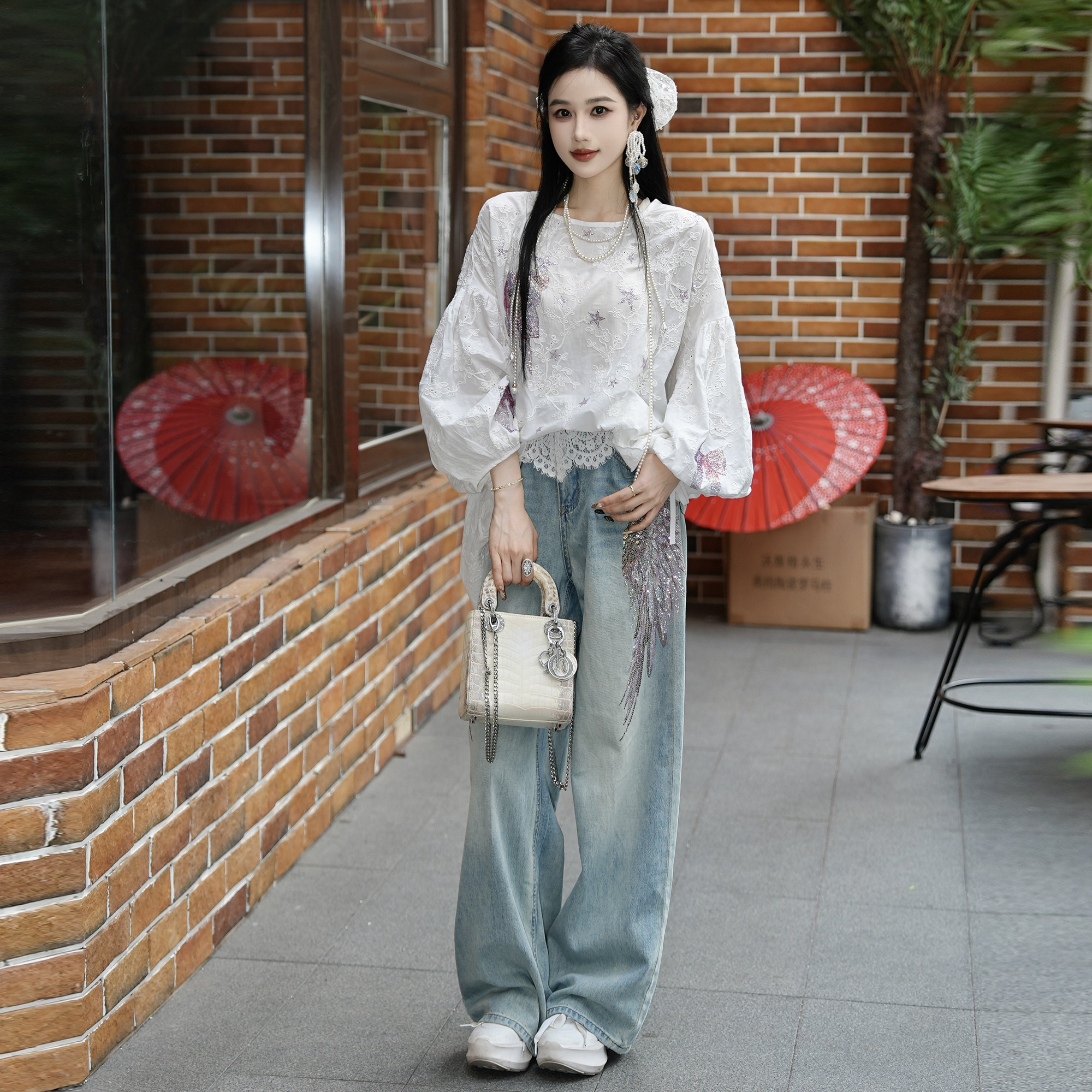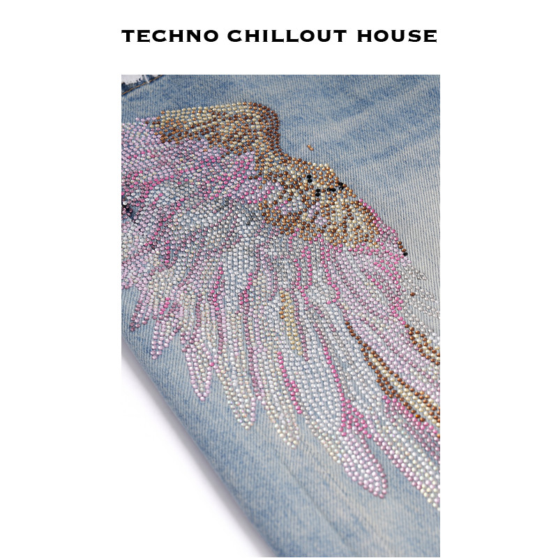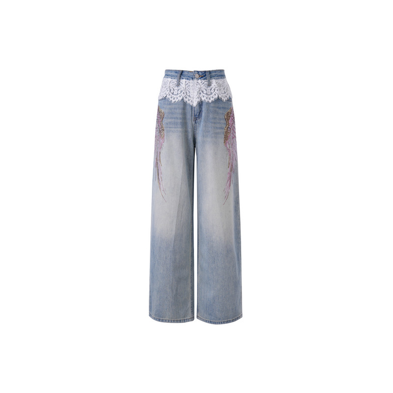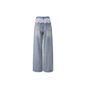 T75A20E5071 春秋新款 TCH私服时尚 潮流烫钻蕾丝拼接高腰牛仔裤