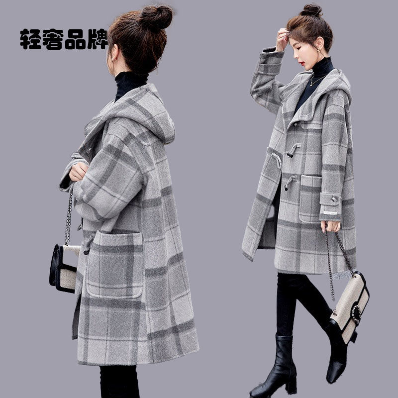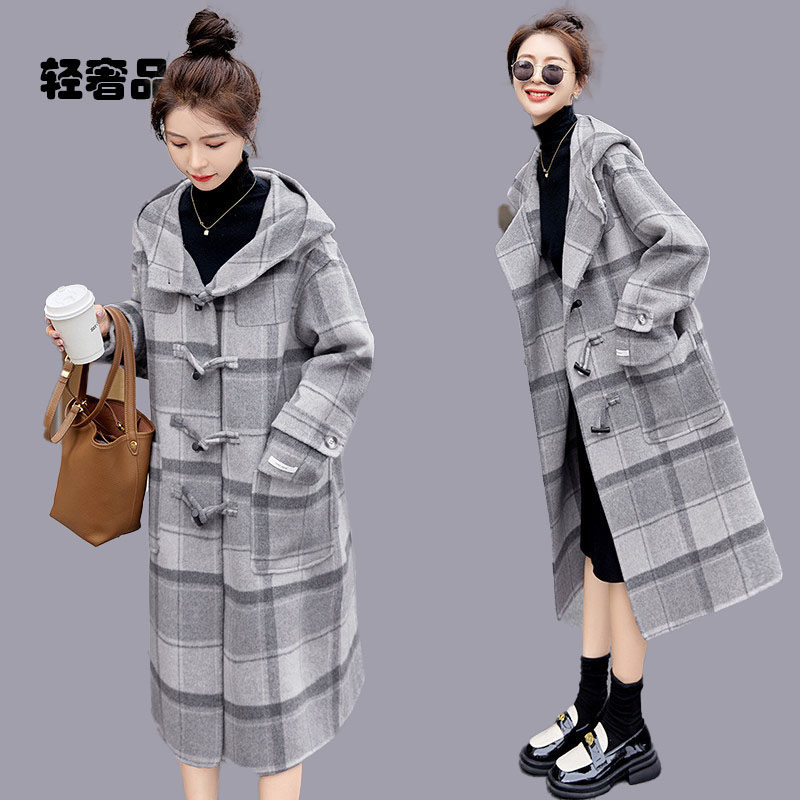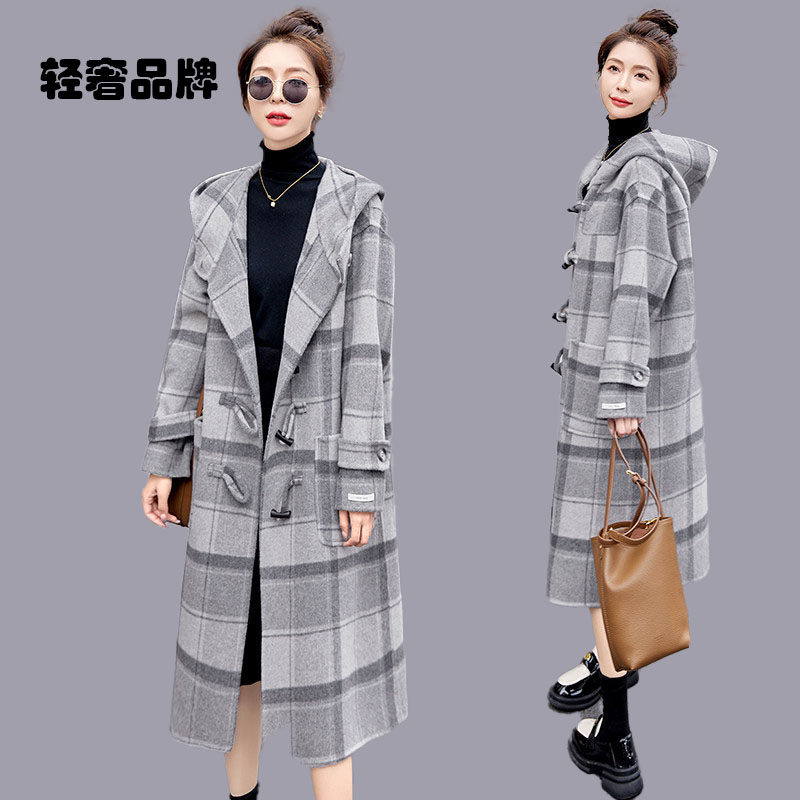 朗姿约定双面羊毛大衣女中长款 2026年秋冬连帽宽松格子羊毛呢外套