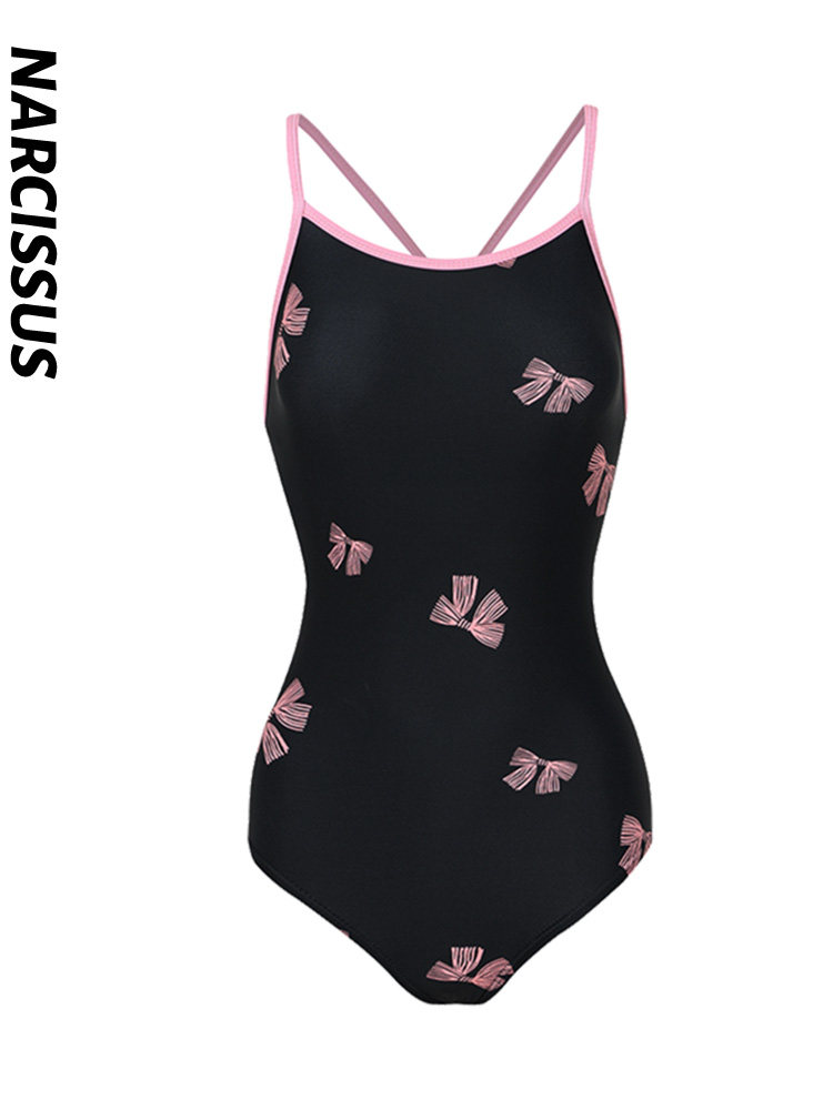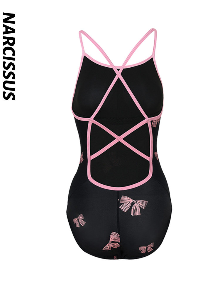 水仙SWIM原创黑粉蝴蝶结显瘦连体三角竞速中低开叉细肩带游泳泳衣