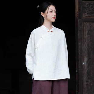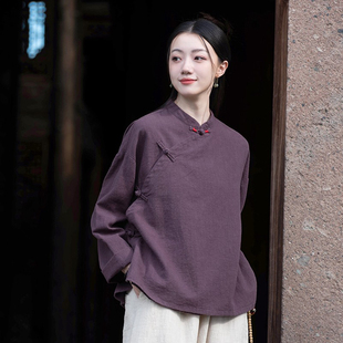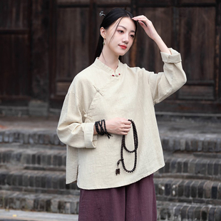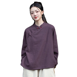 棉麻衬衫 新中式 春秋长袖 复古盘扣禅意女装 斜襟茶服 上衣女2025新款