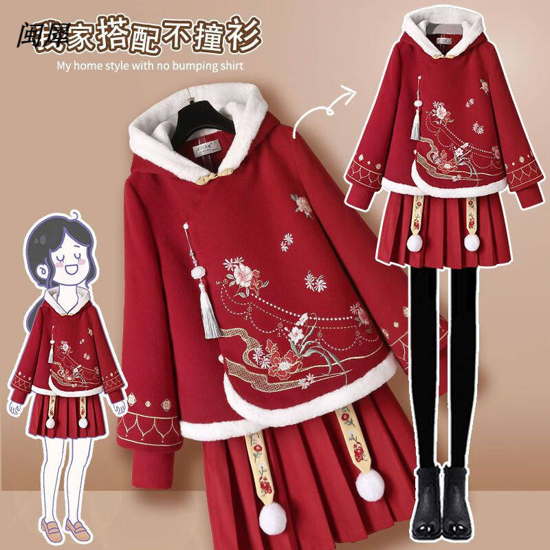 古装 汉服改良版 汉服女中国风连衣裙秋冬套装 长袖 改良旗袍 女新中式