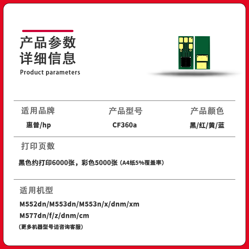CF360a彩色打印机芯片M577dn hdpm适用惠普M553硒鼓芯片HP508A M553dn f粉盒芯片黑色 M552dn
