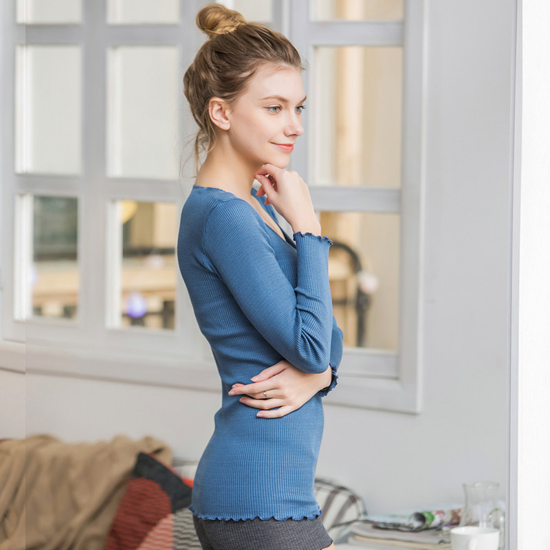 长袖 徐凰喇叭袖 圆领桑蚕丝甜美修身 薄款 真丝针织螺纹丝绸女 打底衫