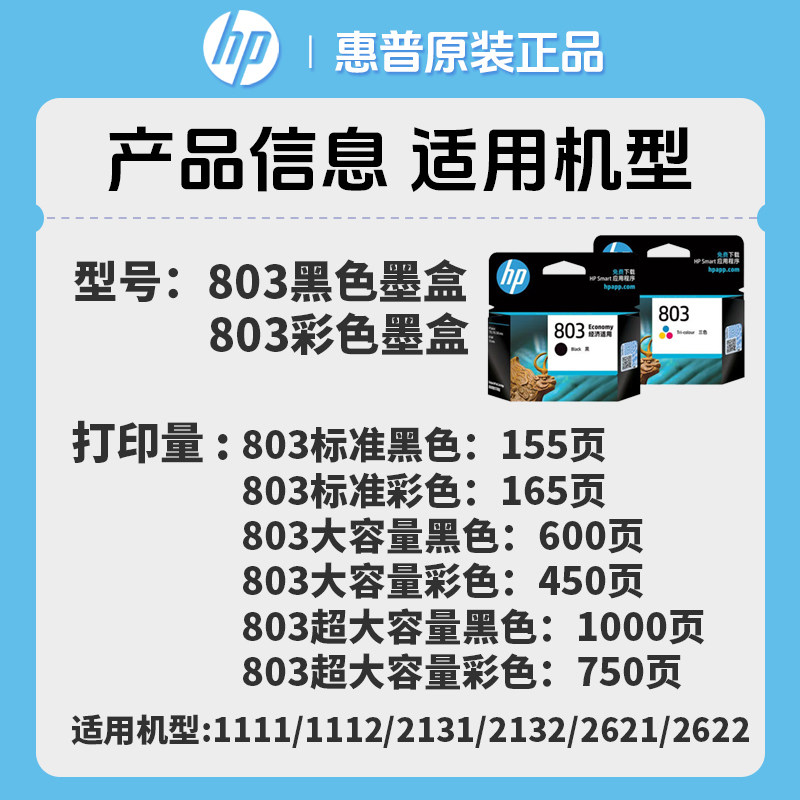 1112 2131 1111 2621 2623喷墨打印机 HP惠普原装 2622 803黑色墨盒彩色墨水盒适用deskjet2132