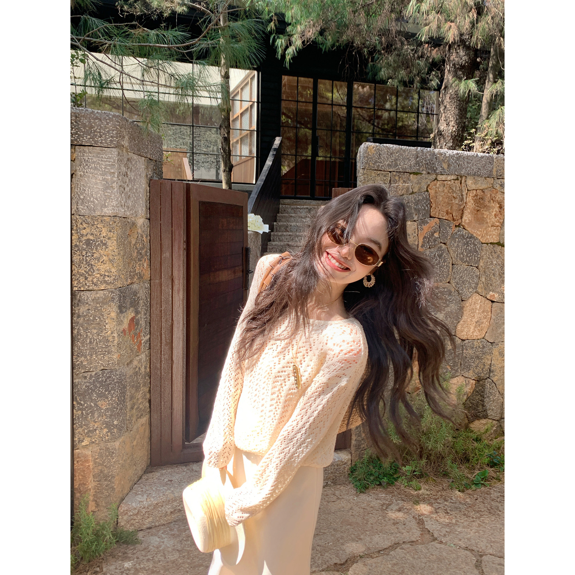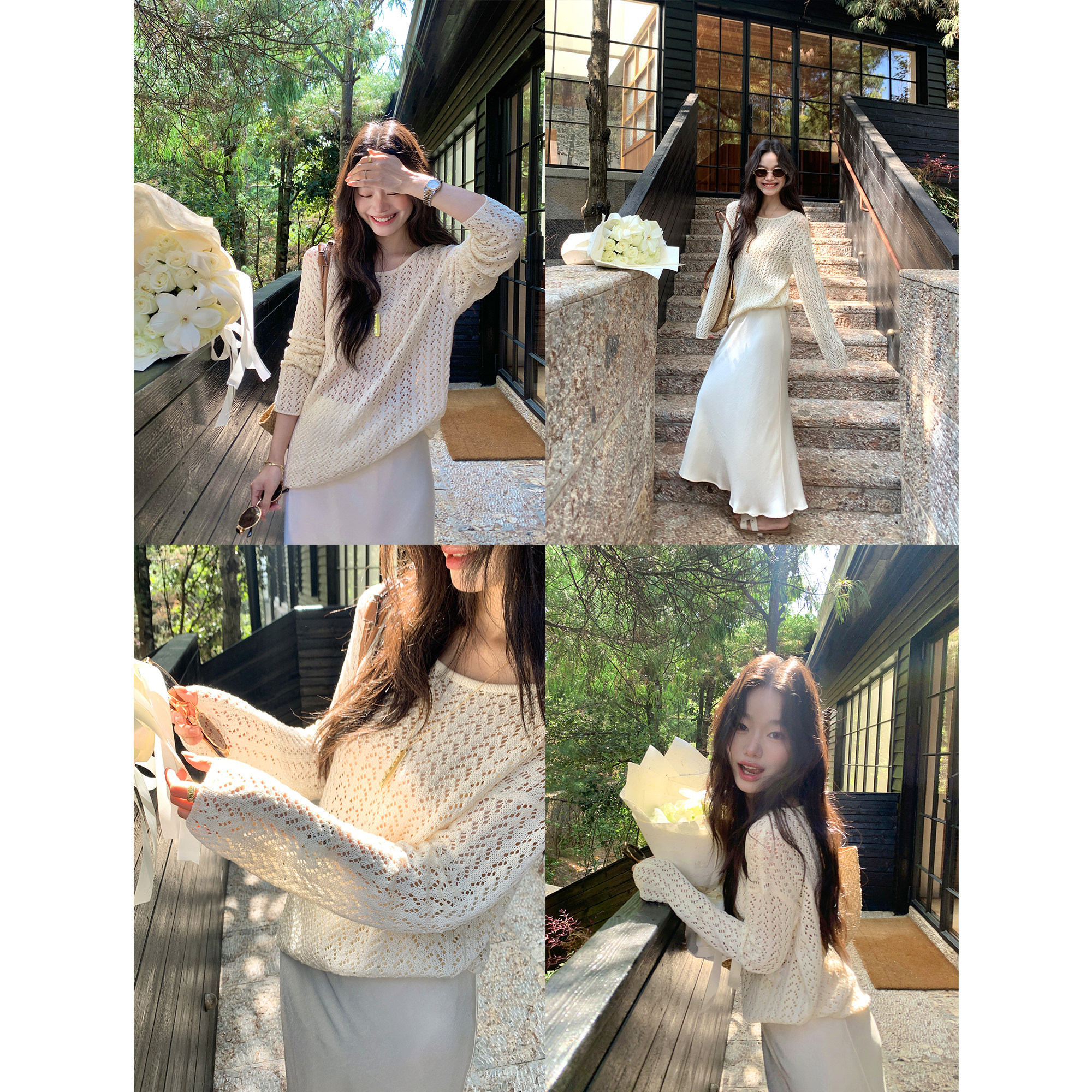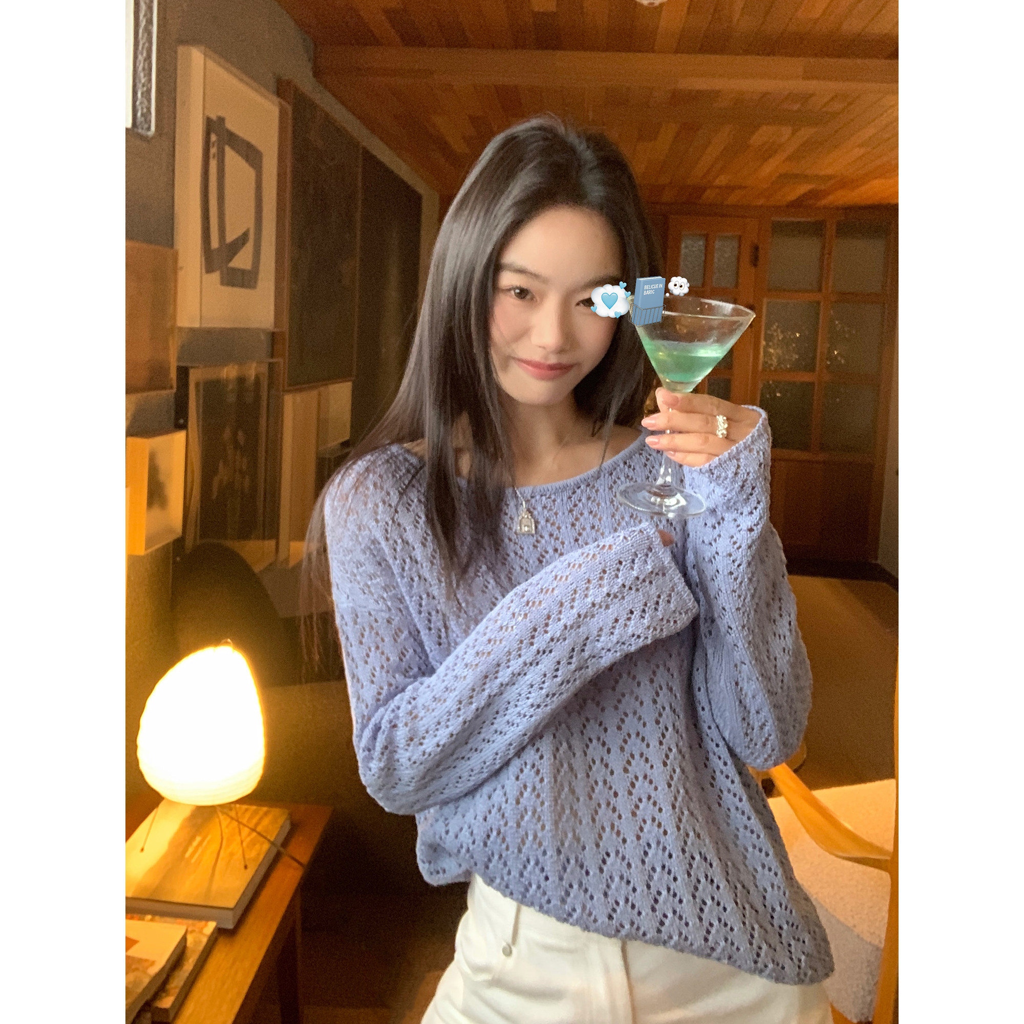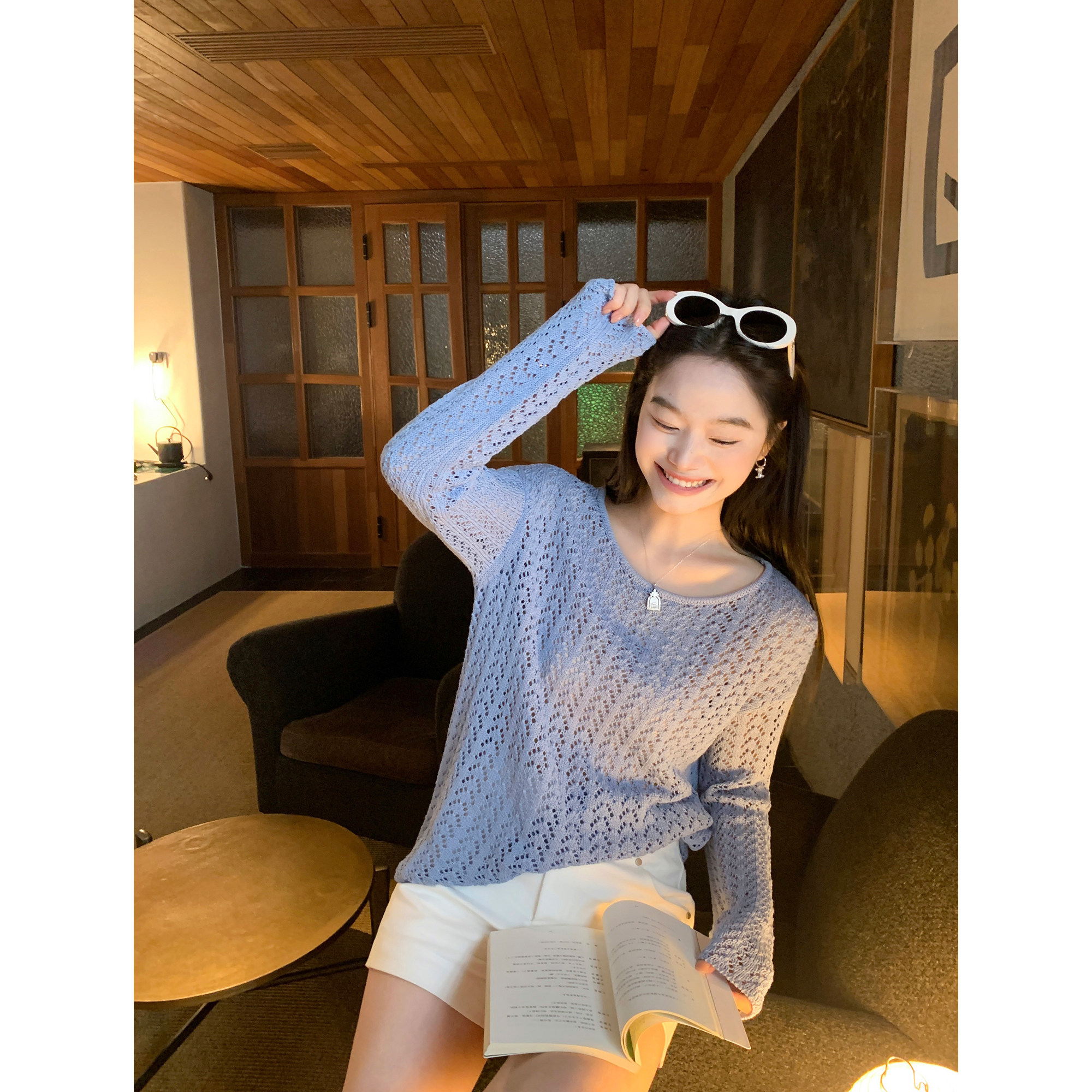 罩衫 pusumede 女慵懒宽松微透长袖 设计感圆领镂空针织衫 松弛配方