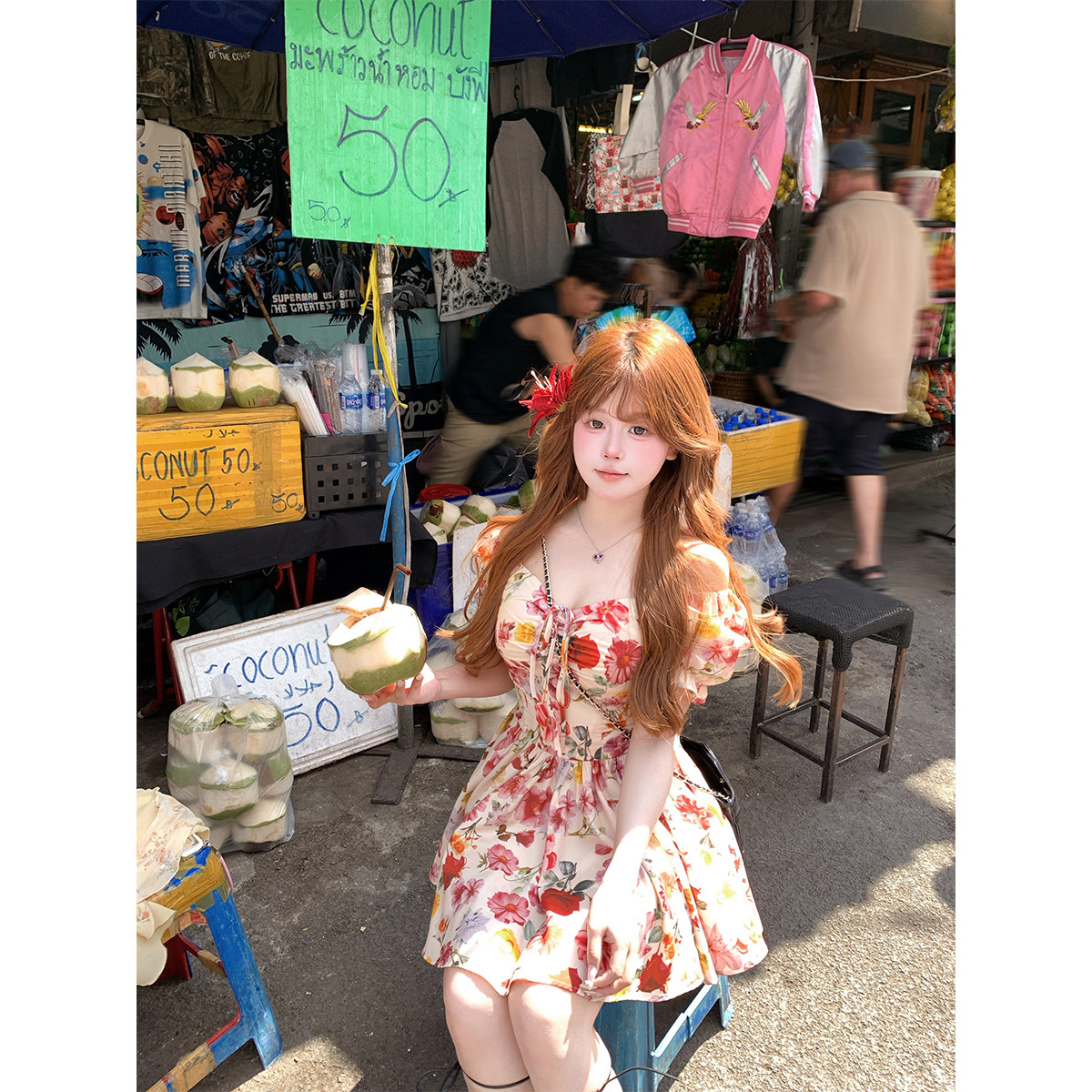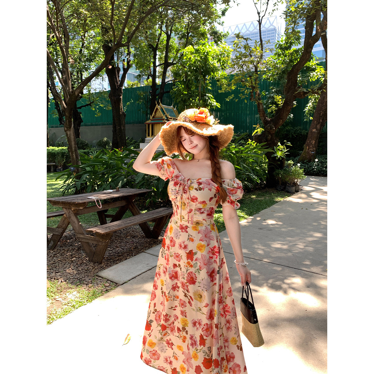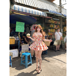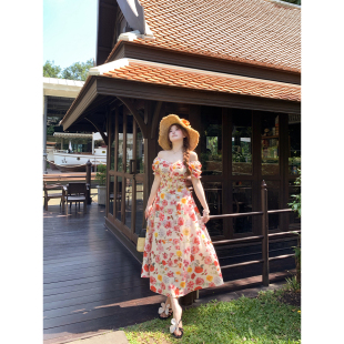 文艺收腰裙子 连衣裙女微胖大码 安妮不火 度假风高饱和印花泡泡袖