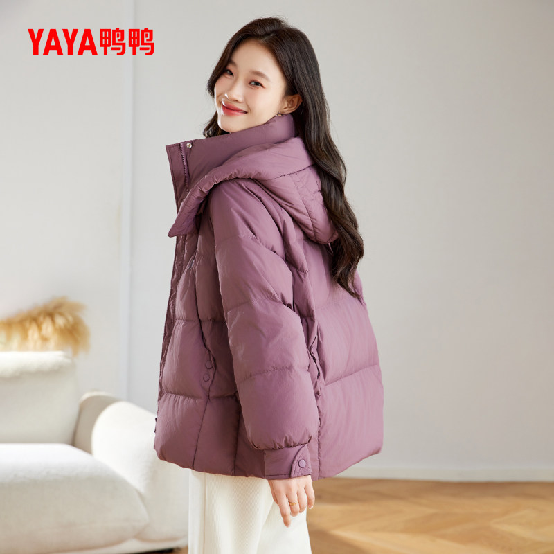 撞色格纹小个子立领鸭绒外套 新款 紫涵短款 连帽羽绒服女2025年冬季