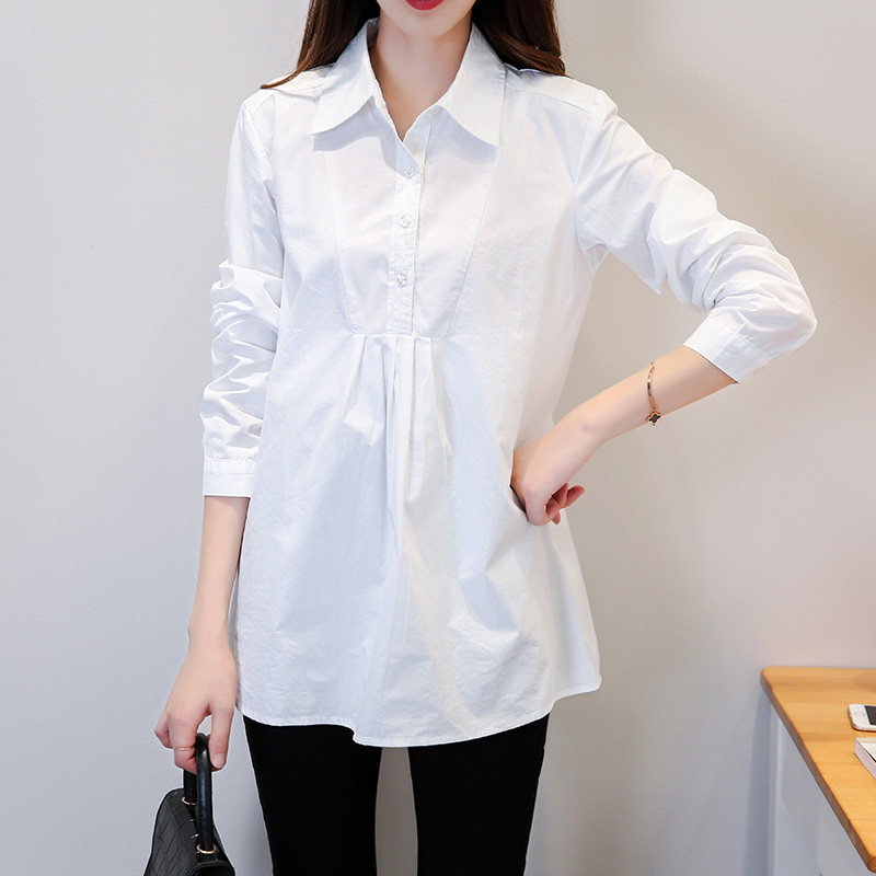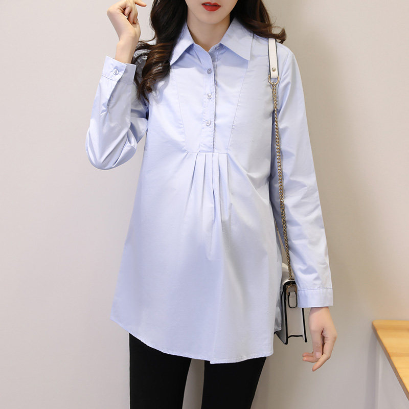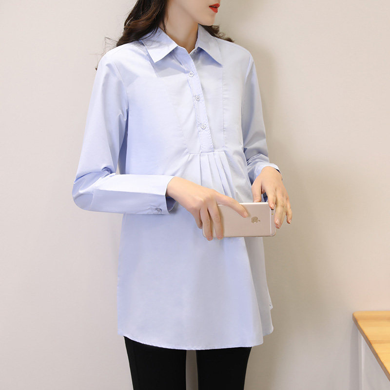 上衣时尚 孕妇衬衣春装 职业中长款 长袖 宽松蓝色工W作服纯棉衬 新款