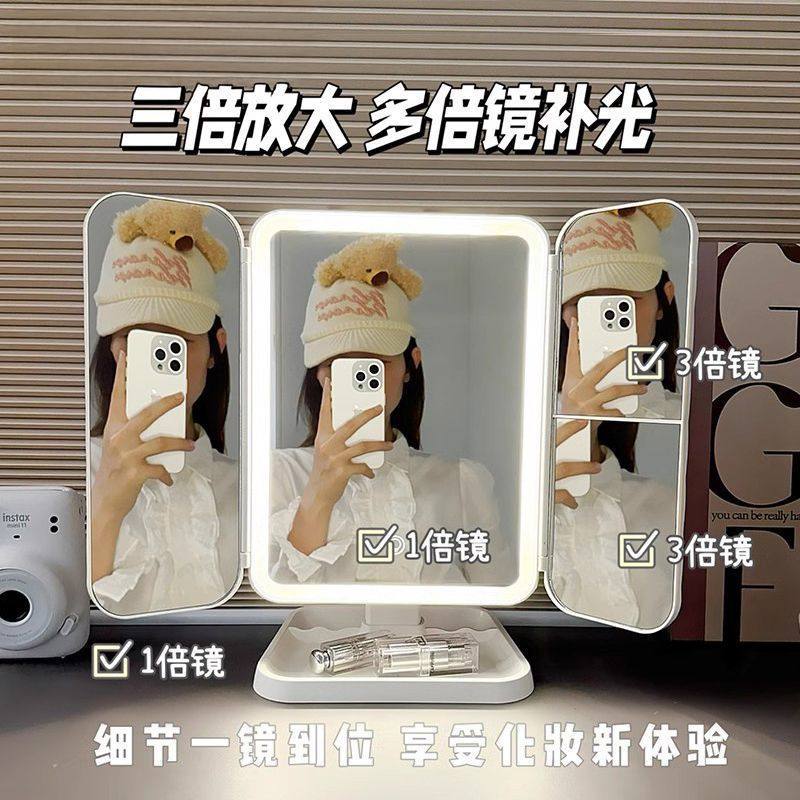 led美妆镜子化妆镜带灯贝壳三折叠桌面台式 宿舍补光高镜旋转精致
