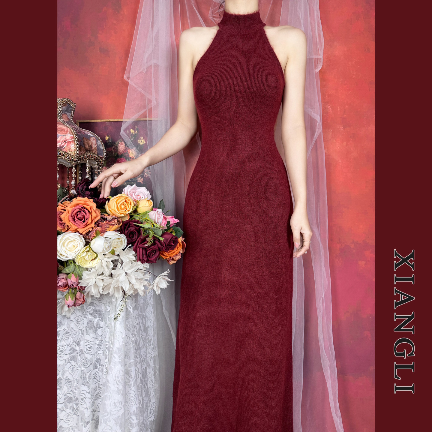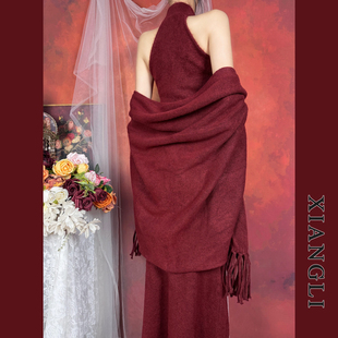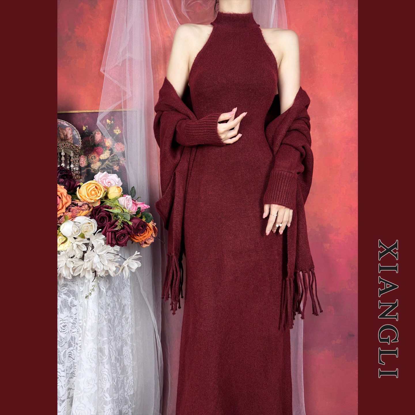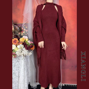 流苏披肩外套女毛衣两件套装 巷里法式 针织包臀红色连衣裙秋冬修身