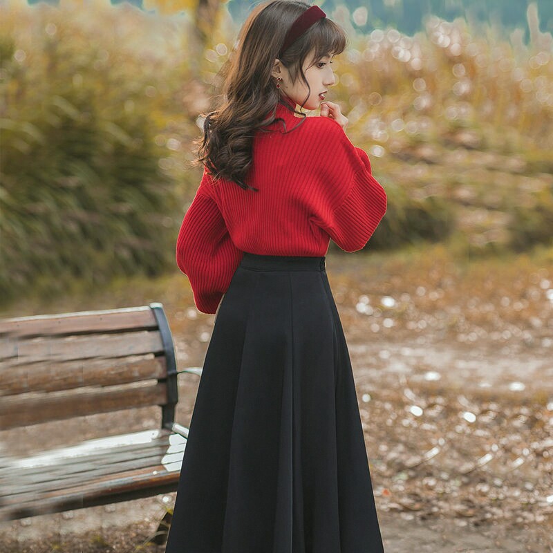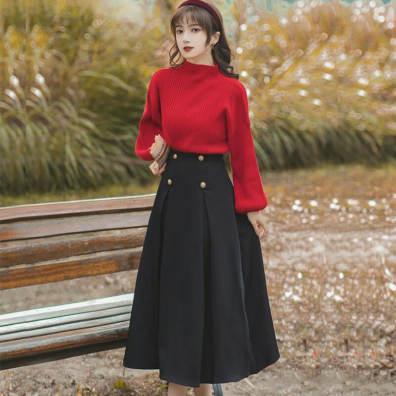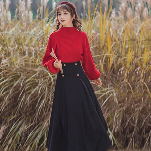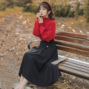 单 港风女复古红色半高领毛衣慵懒两件套秋冬配半身a字裙子 套装