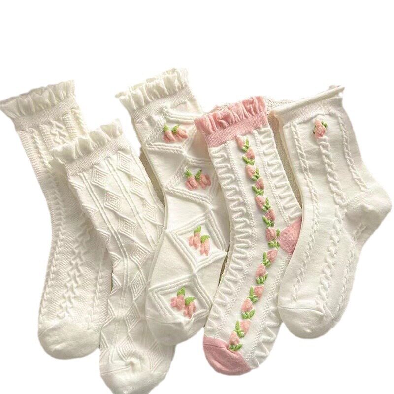 秋冬新款 中筒日系纯色百搭女涤棉袜泡泡口花边公主风长筒袜子批
