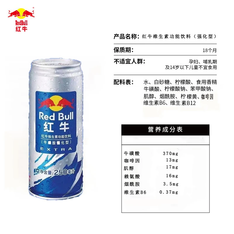 RedBull红牛维生素功能饮料牛磺酸强化型250ml 6罐整箱24罐批特价