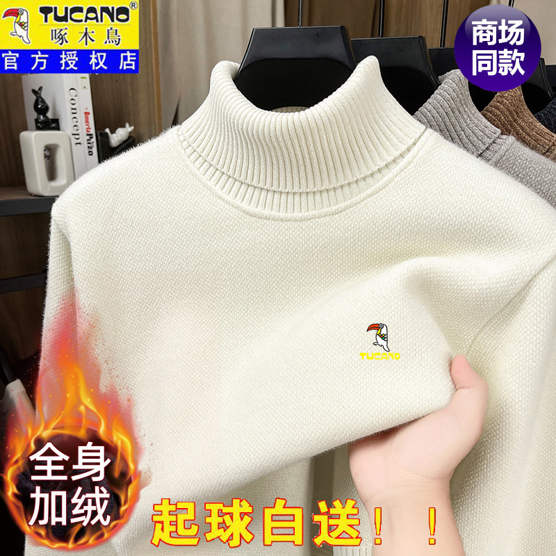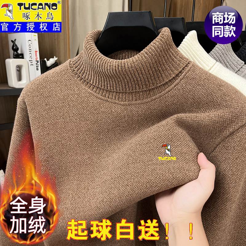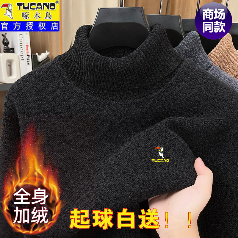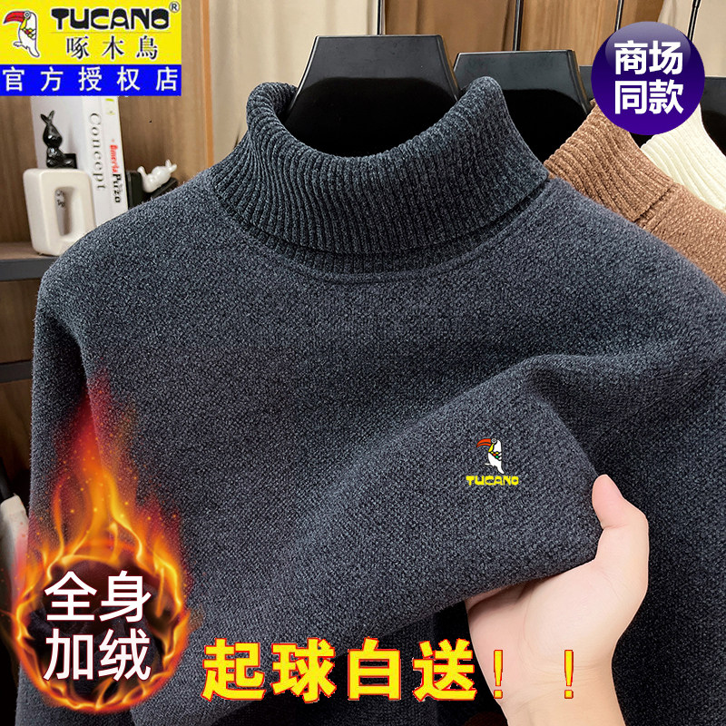 保暖打底羊毛衫 特厚男装 上衣 毛衣加绒加厚可翻高领冬装 啄木鸟男士
