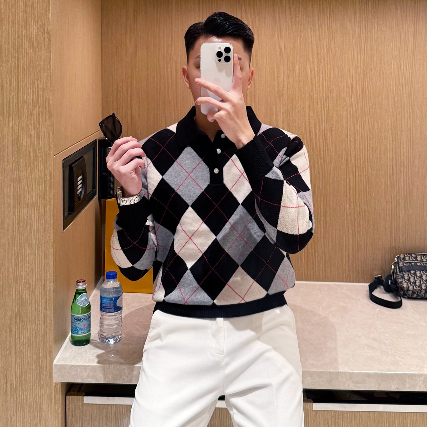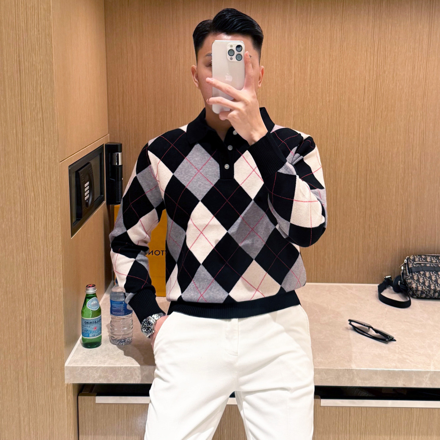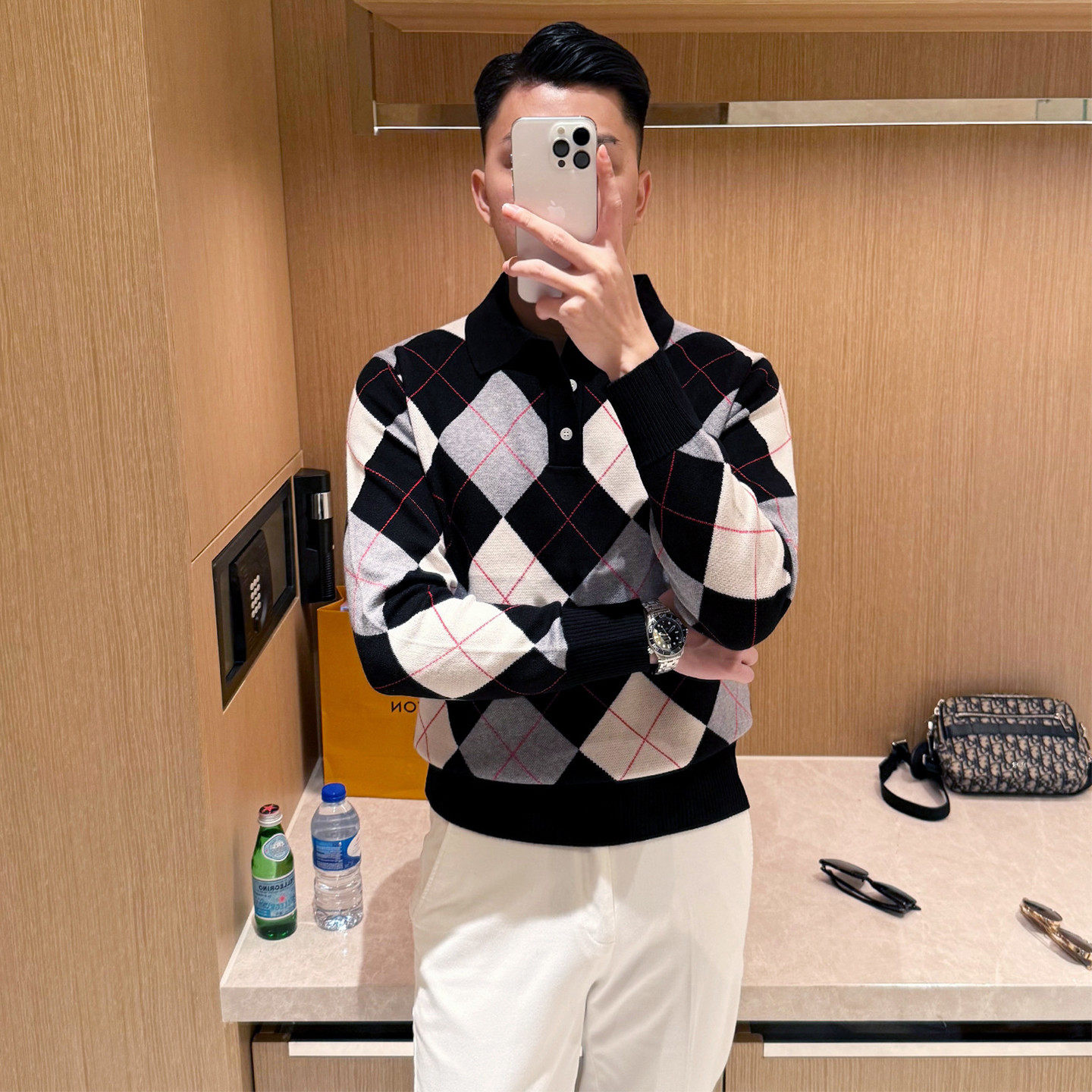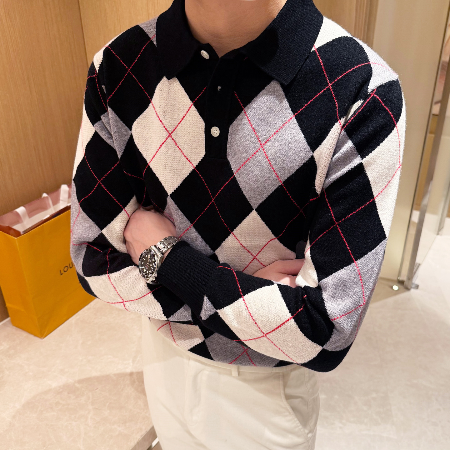 翻领针织衫 polo衫 男士 菱格撞色长袖 男 上衣秋冬新款 复古英伦风修身