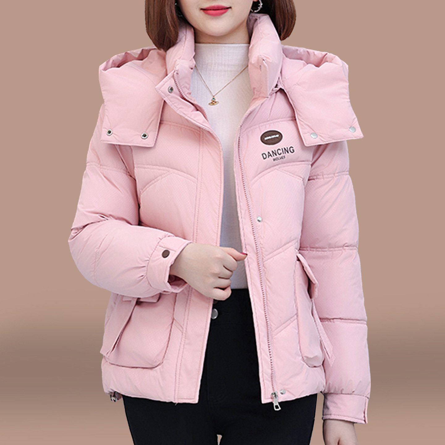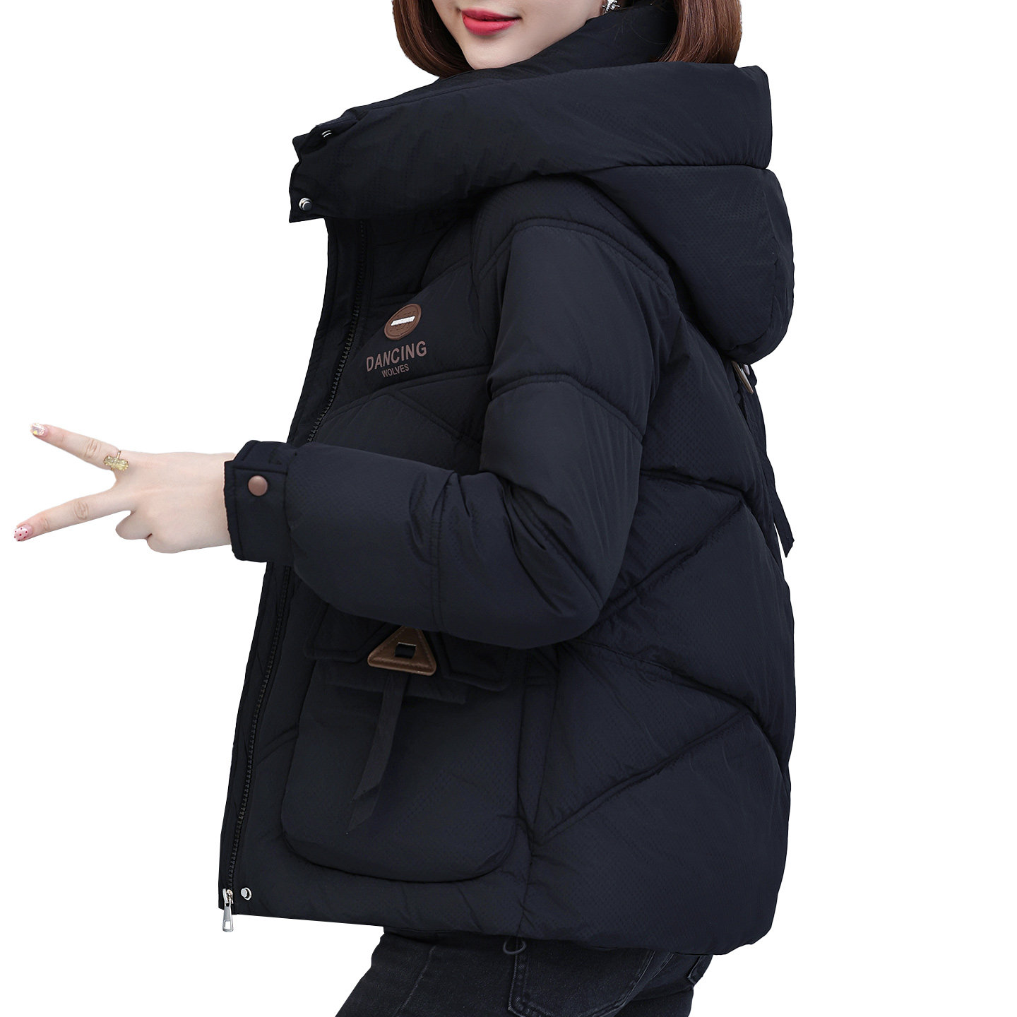黑色休闲百搭连帽夹克上衣 胖mm双面穿毛绒棉服外套女冬季 大码 女装